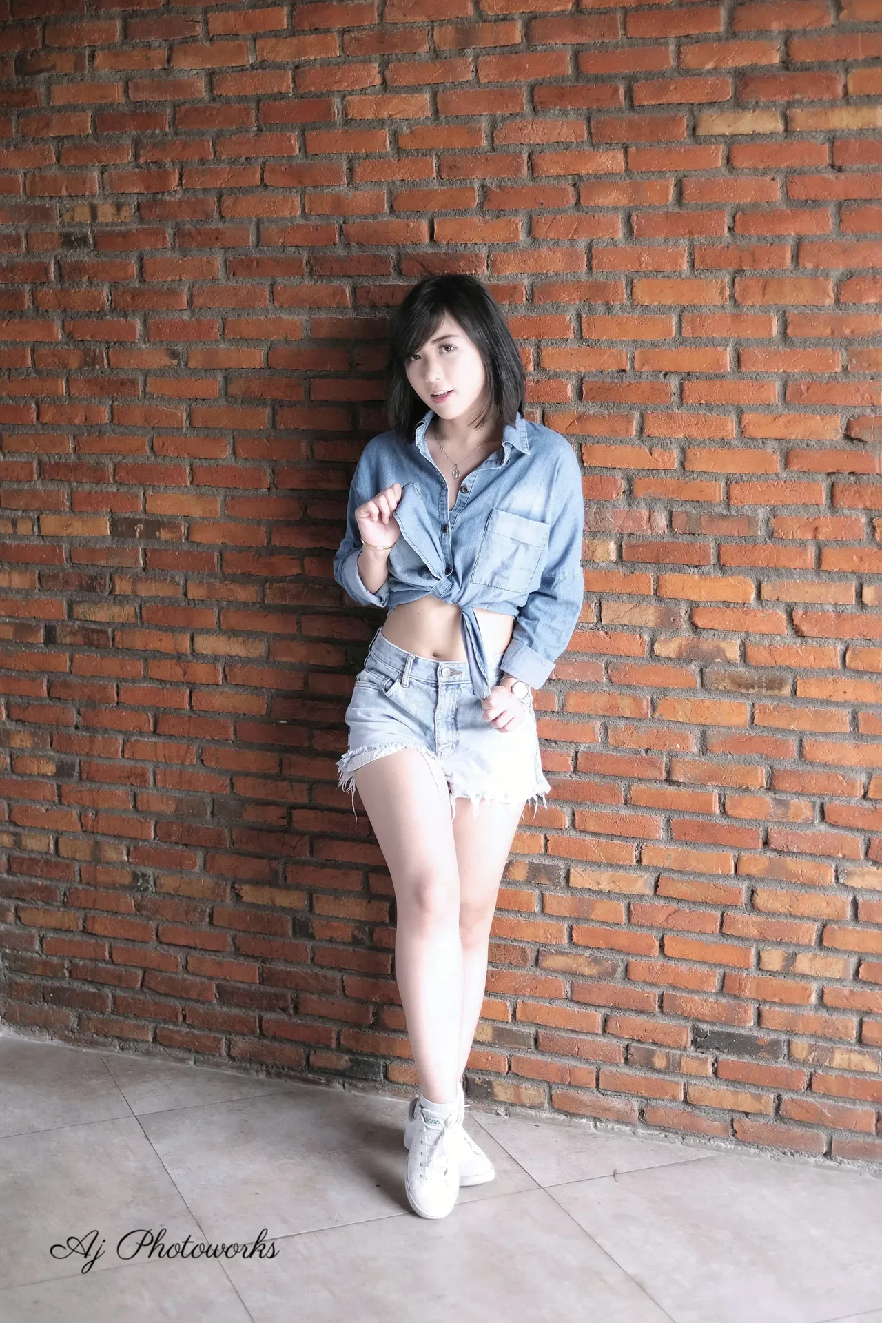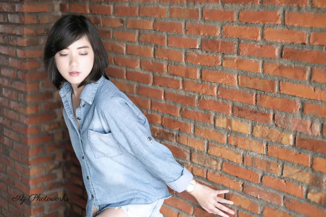 Cool confidence meets urban charm in a series of denim-clad poses against textured brick backdrops.