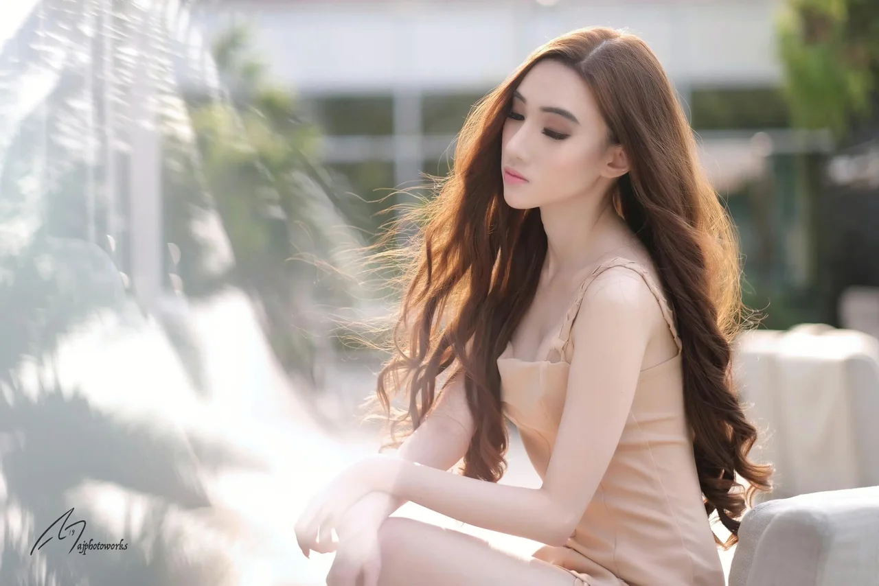 Sunlight dances across the flowing fabric of her dress, highlighting the contrast between grace and boldness.