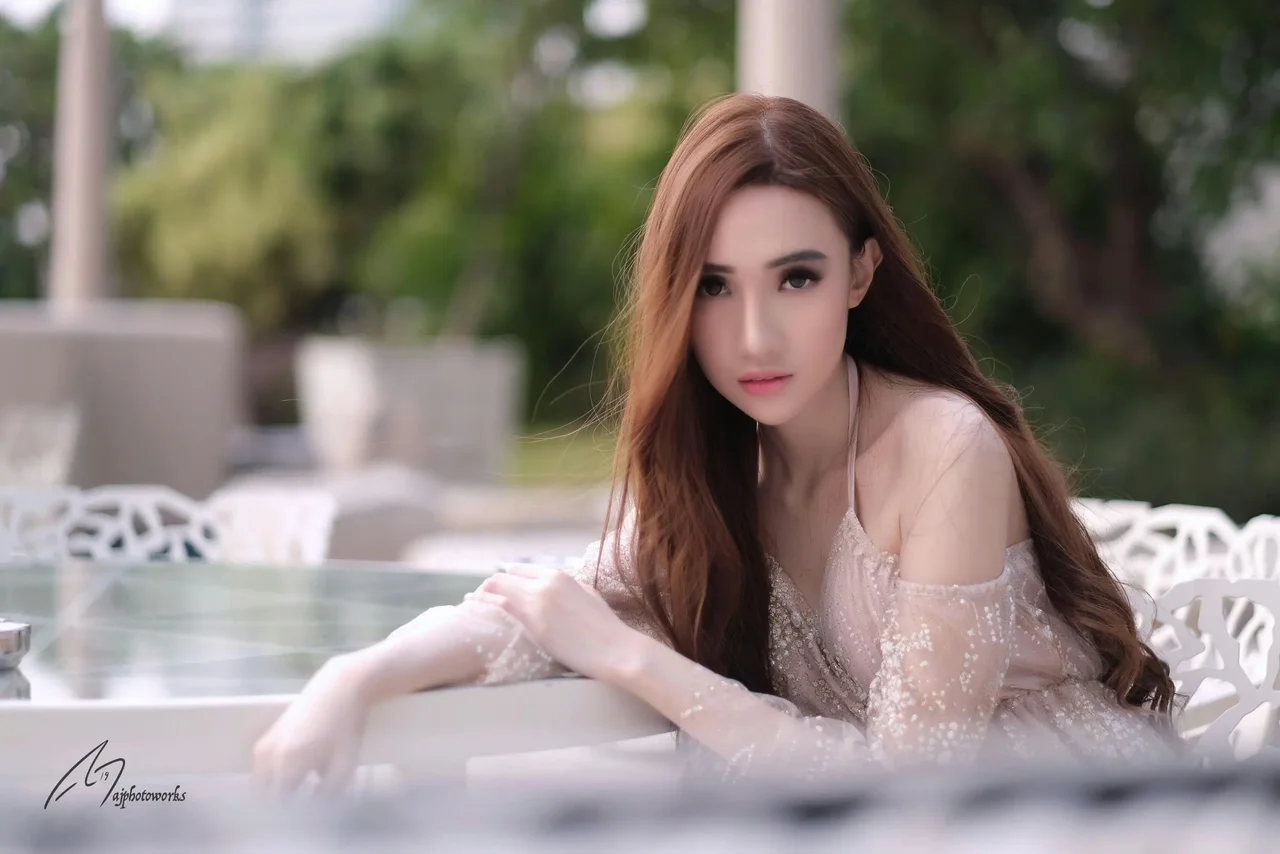 Elegance meets nature in a serene outdoor setting, capturing ethereal beauty.