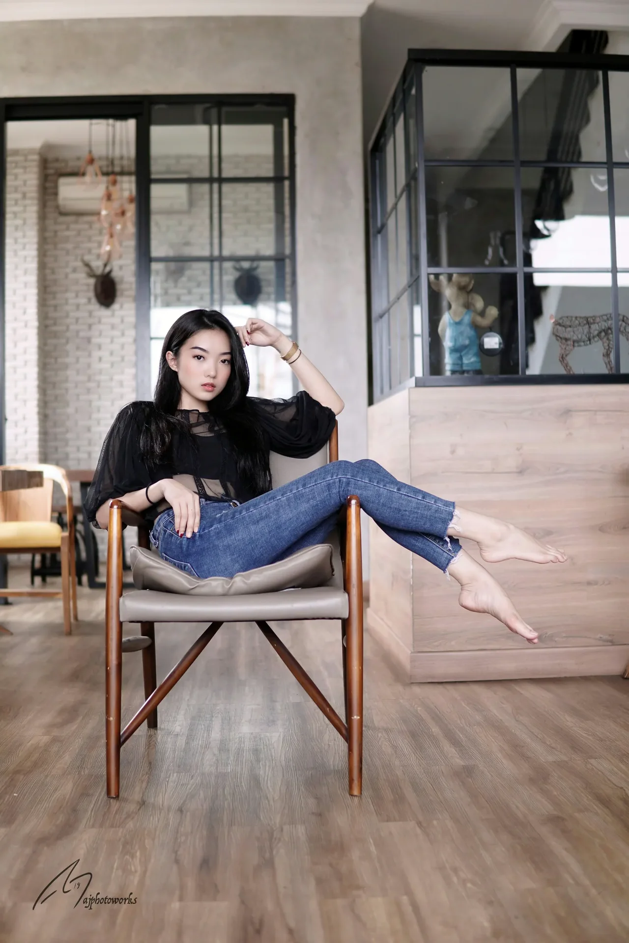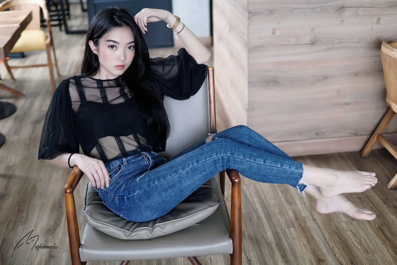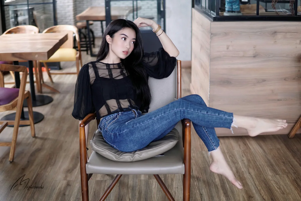 A poised blend of casual elegance captured in a modern café setting, where sheer details meet urban textures.