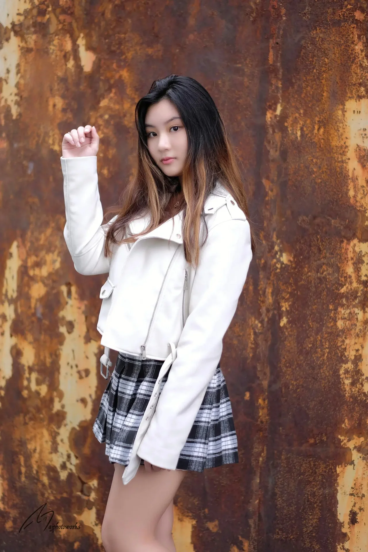 A model poses confidently against vibrant graffiti and rustic walls, blending streetwear with urban artistry.