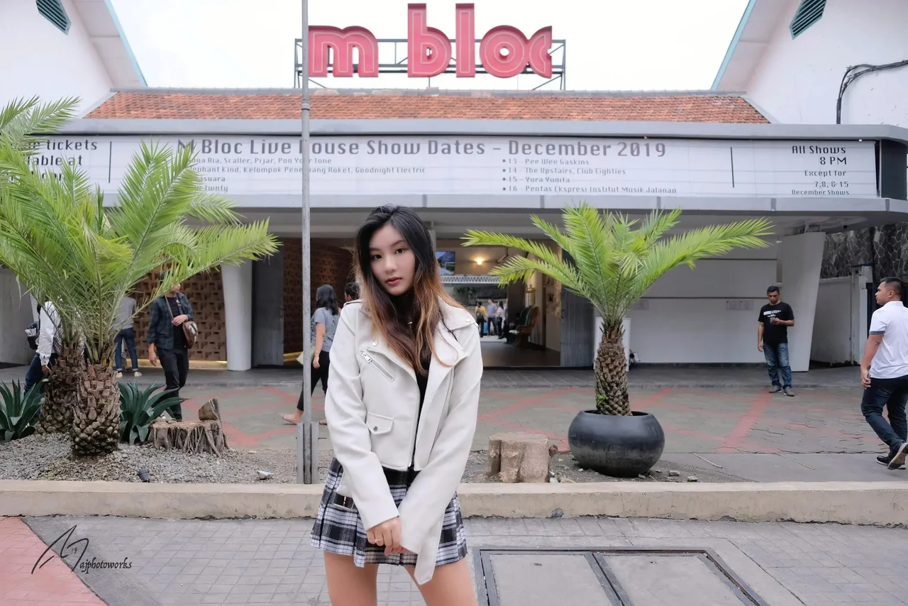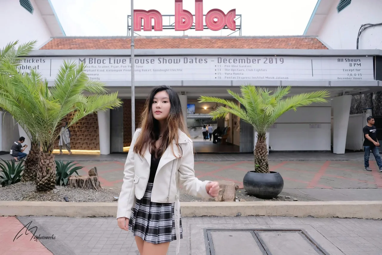 Confident portrait of a woman in a minimalist urban setting, showcasing streetwear style.