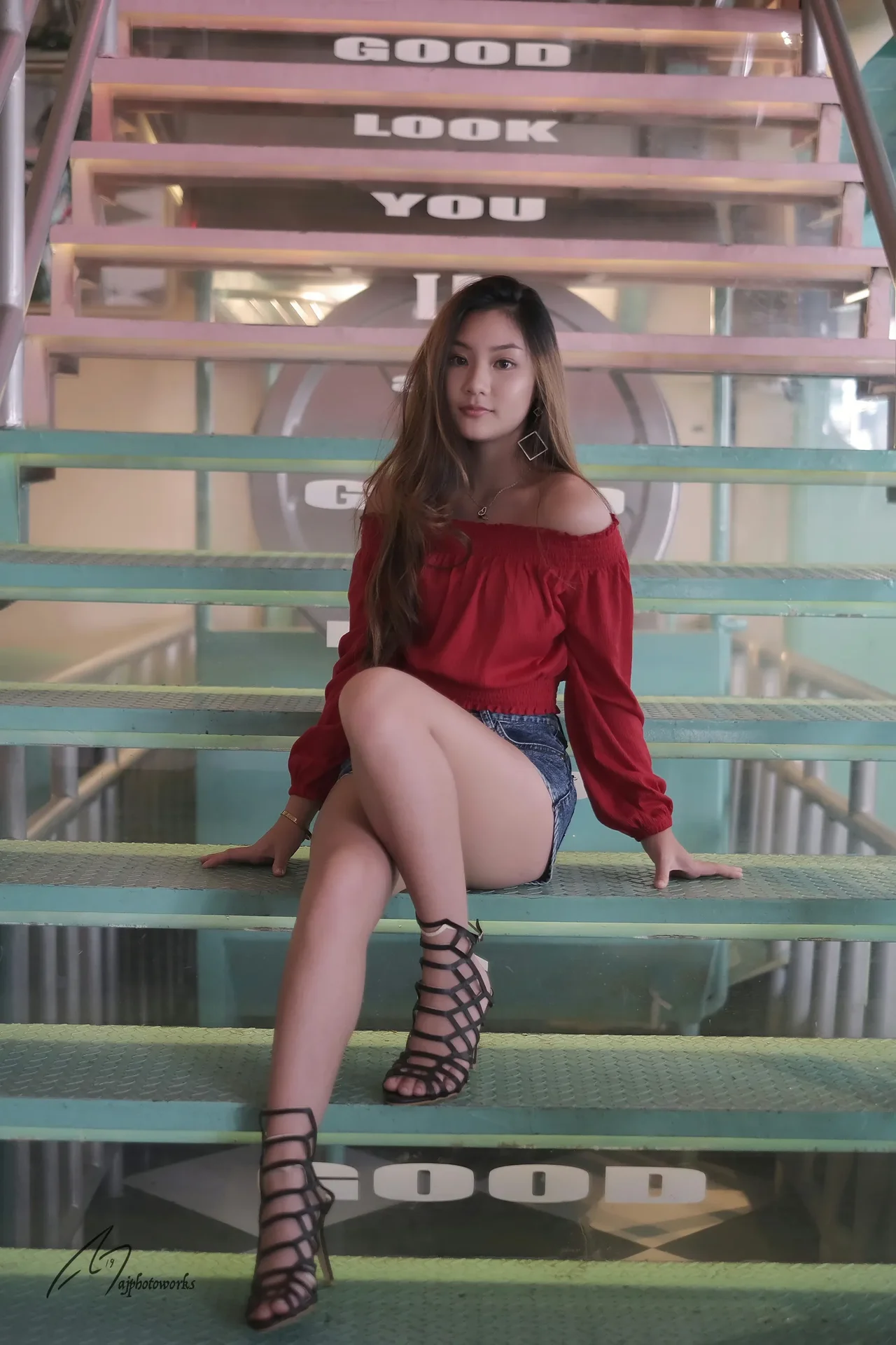 Vibrant confidence meets modern fashion on urban steps.