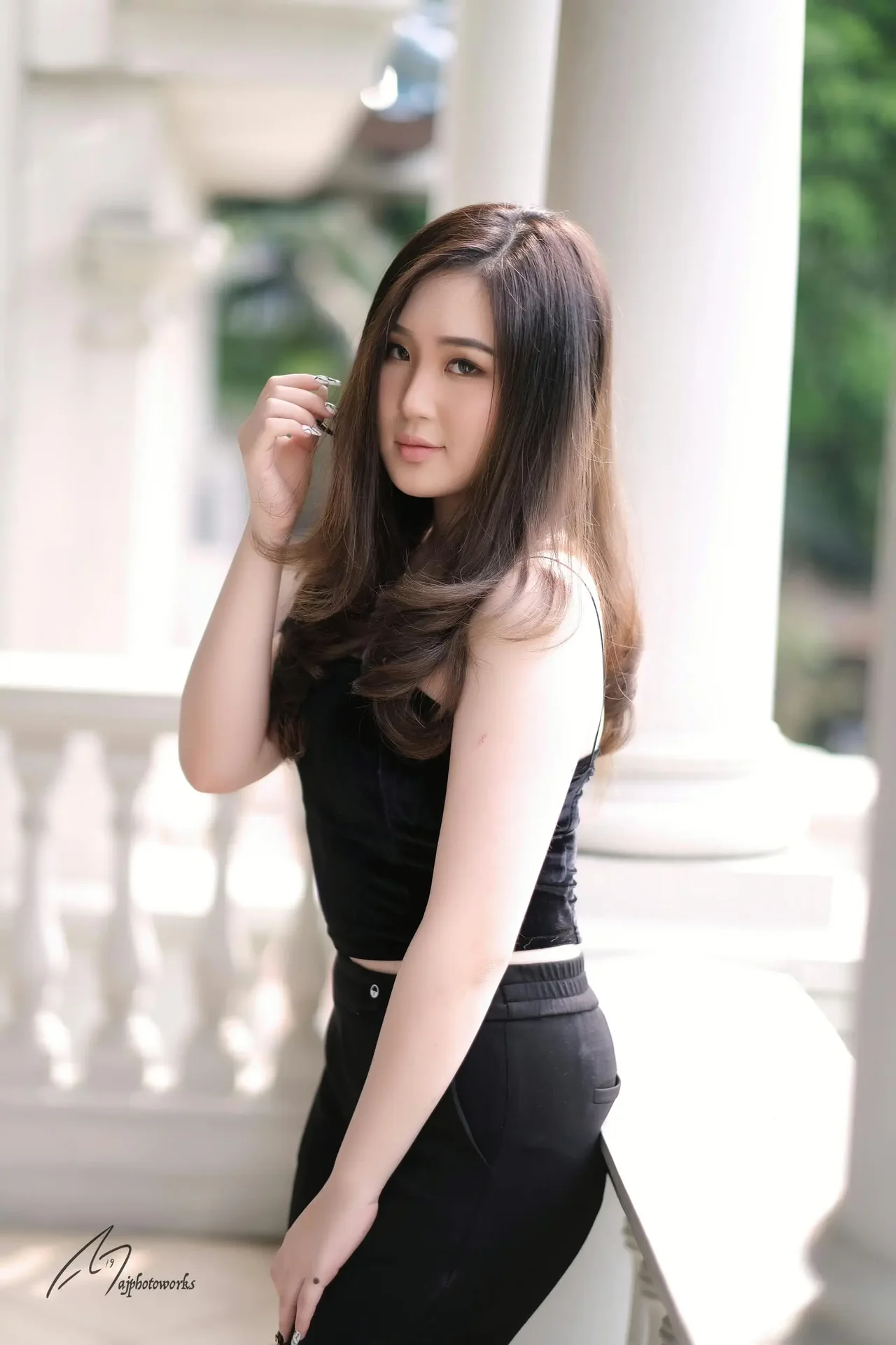 A fashionable woman in diverse outfits posing near a pool, on a balcony, and in a park, showcasing playful and sophisticated styles.