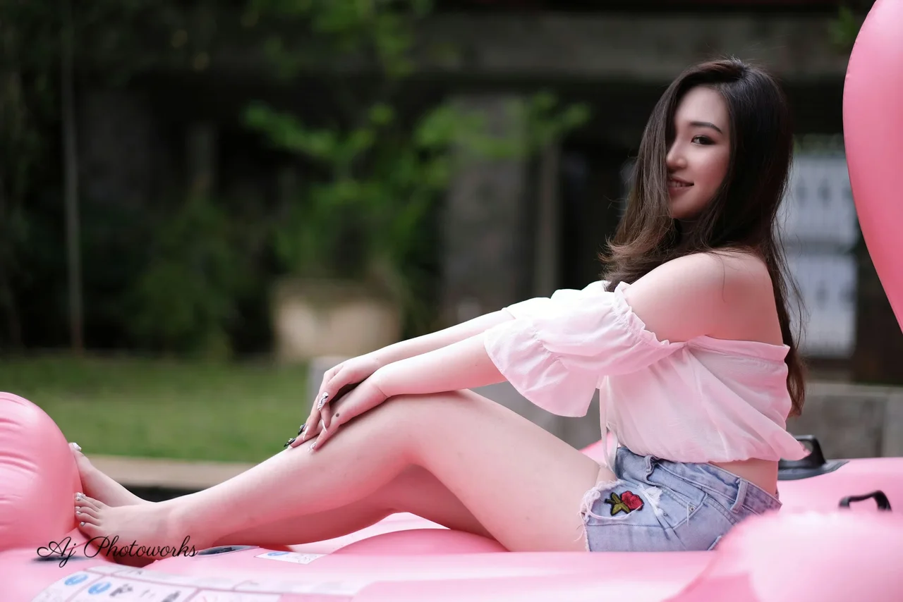 A vibrant and playful lakeside scene featuring a whimsical pink flamingo float, balancing comfort and whimsy