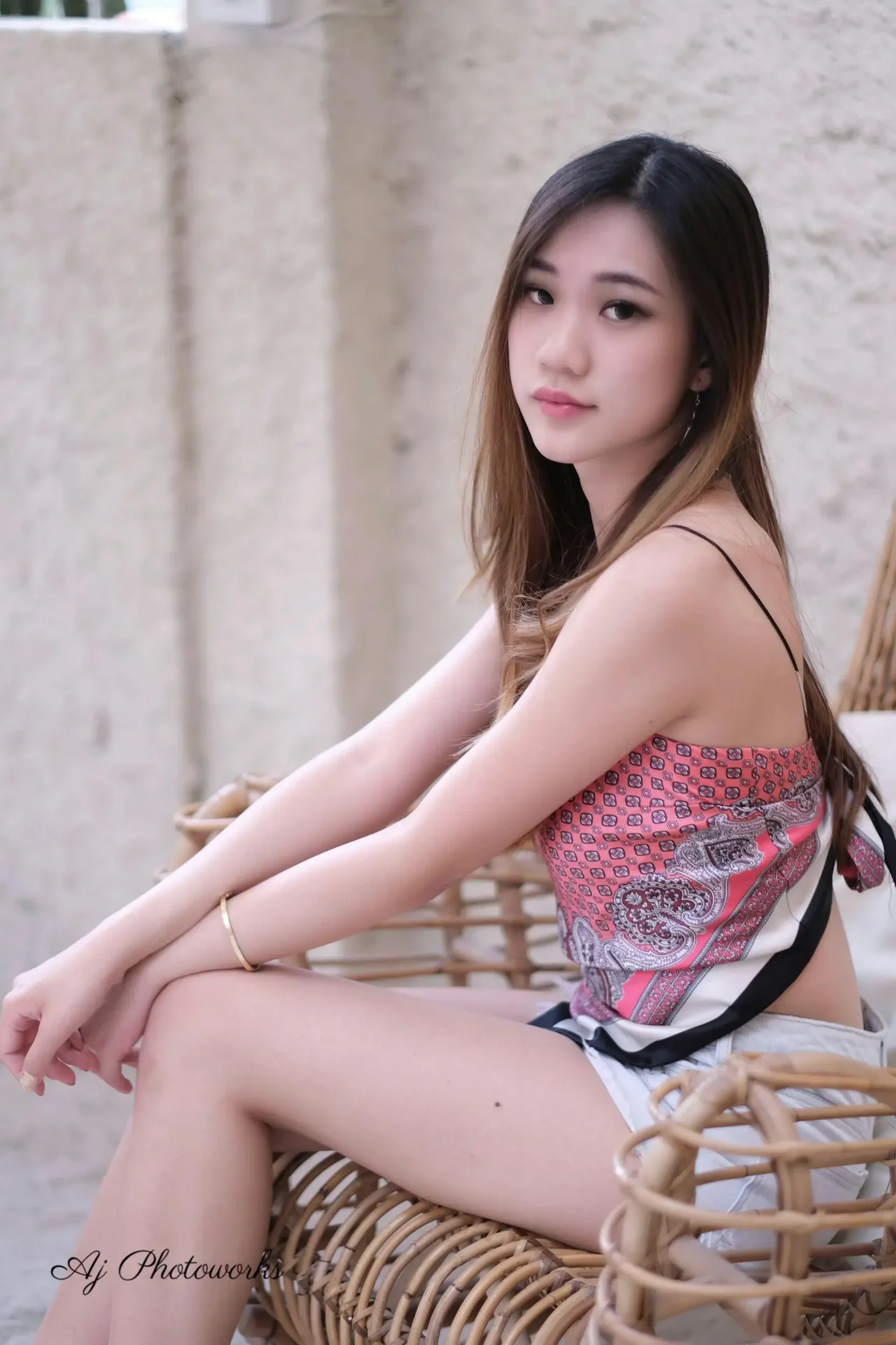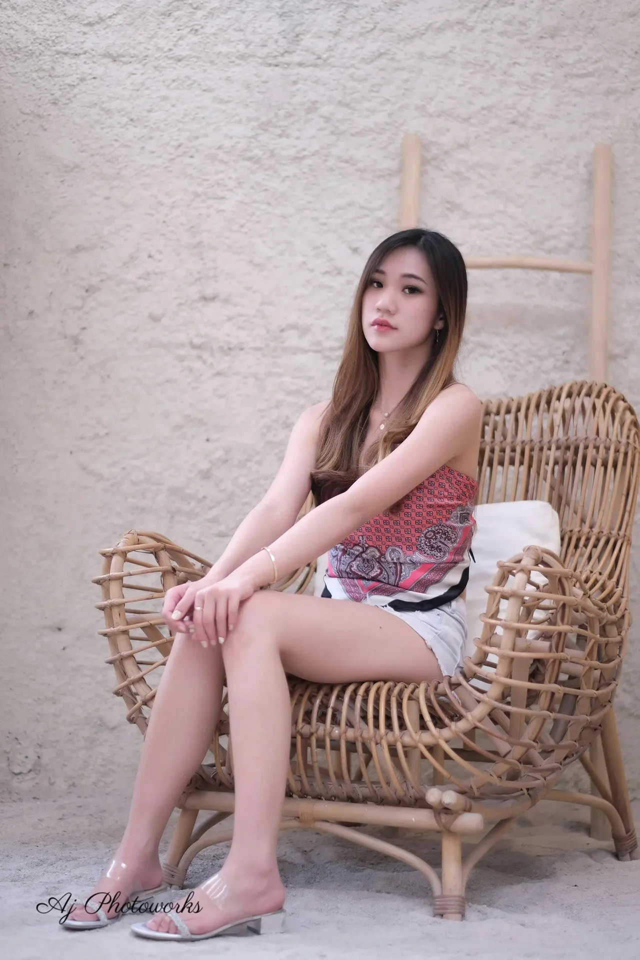 A woman in a stylish leopard-patterned top and denim shorts lounges on a woven chair, her feet barefoot, with a textured background and soft natural lighting creating a relaxed, editorial aesthetic. Transparent heels and gold bracelet add subtle elegance.