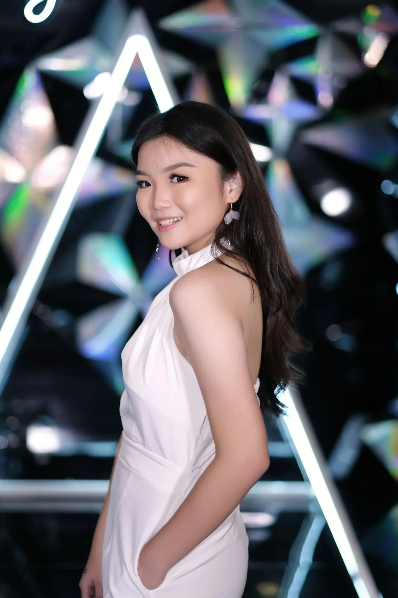 Elegance meets modernity: a radiant ethereal figure in a minimalist white ensemble against a luminous, neon-lit geometric dreamscape.