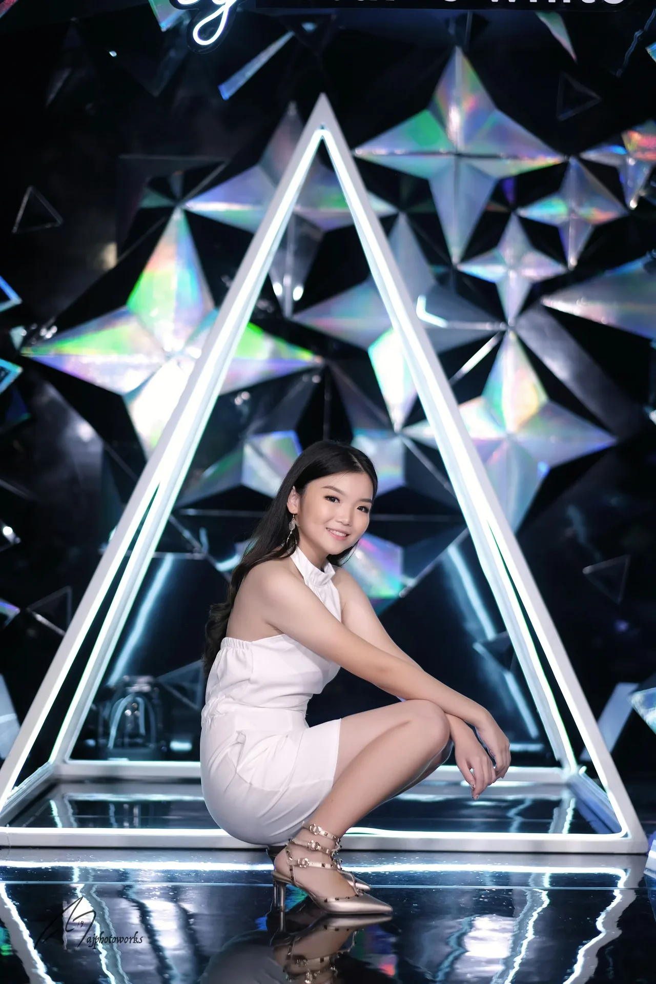 A futuristic fashion portrait in a geometric, neon-lit studio with iridescent star-shaped backdrops.