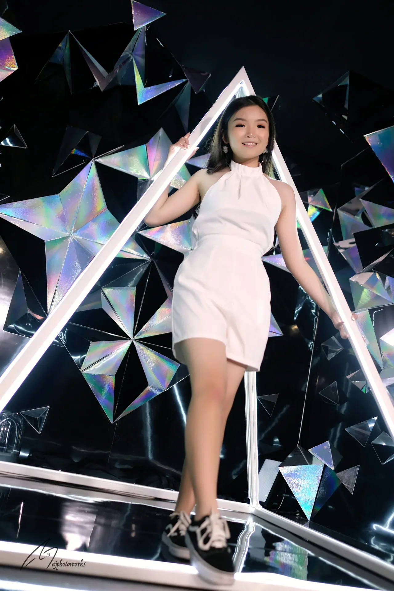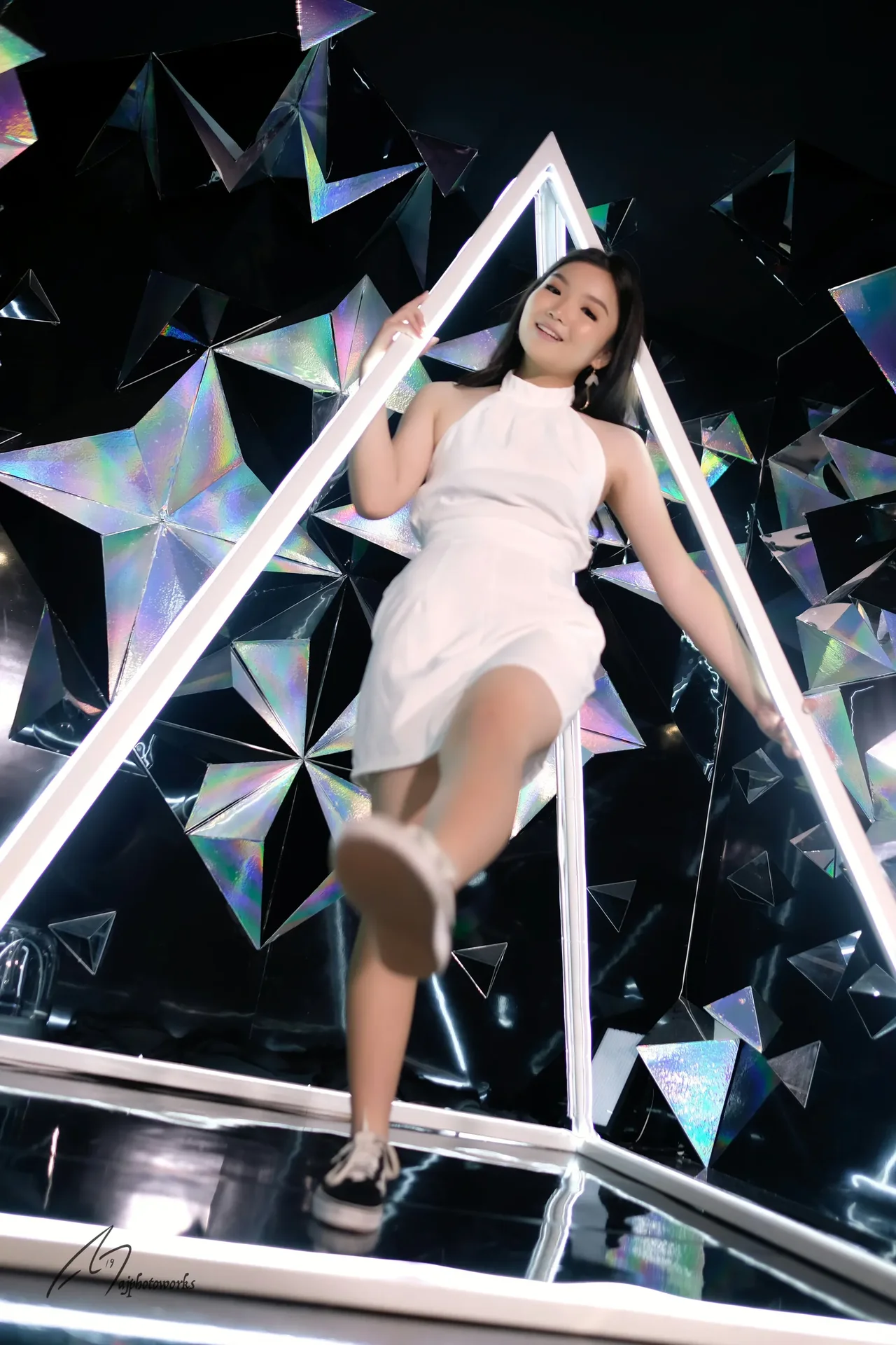 A bold fusion of futuristic fashion and artistry, featuring a model in a sleek white knee-length dress, striking a dynamic pose against a metallic backdrop radiating geometric light projections and mirrored triangular forms.