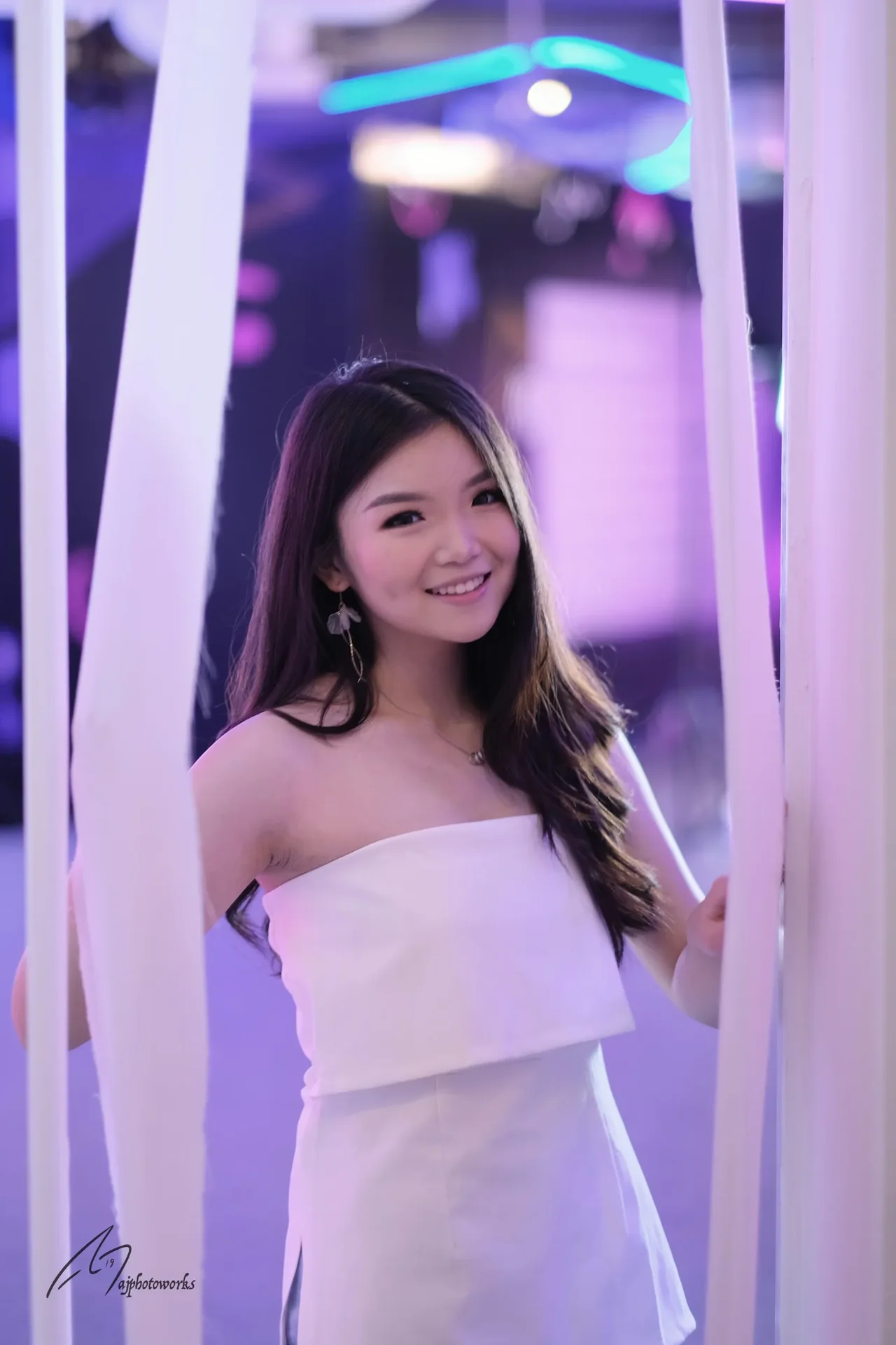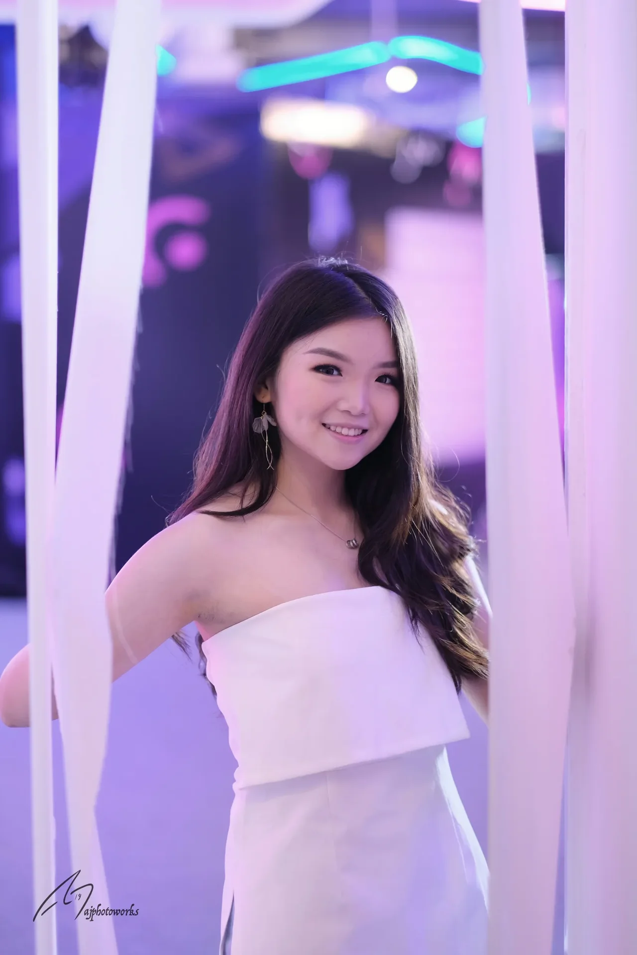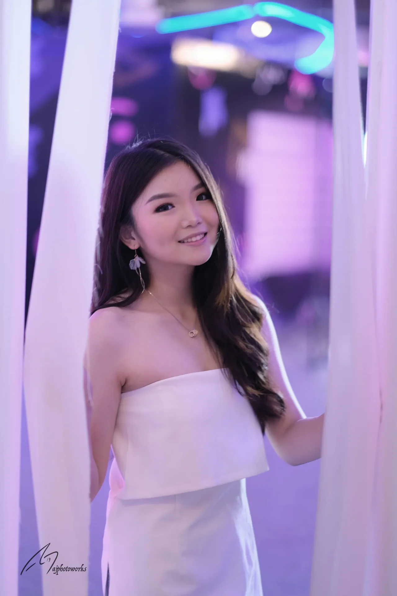 Young Asian woman in a white strapless dress stands between abstract white panels, surrounded by colorful neon lights and a vibrant urban backdrop, evoking a modern, editorial aesthetic.