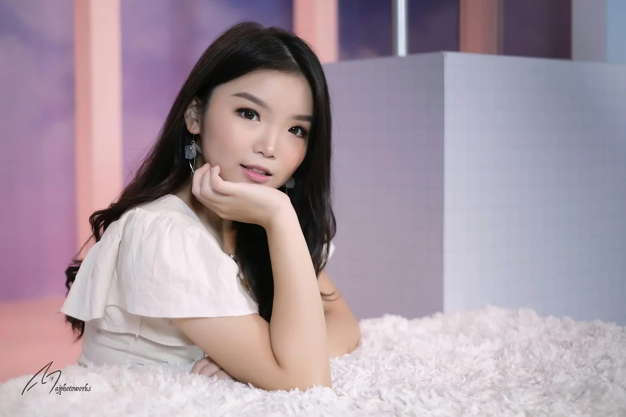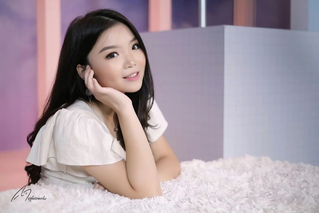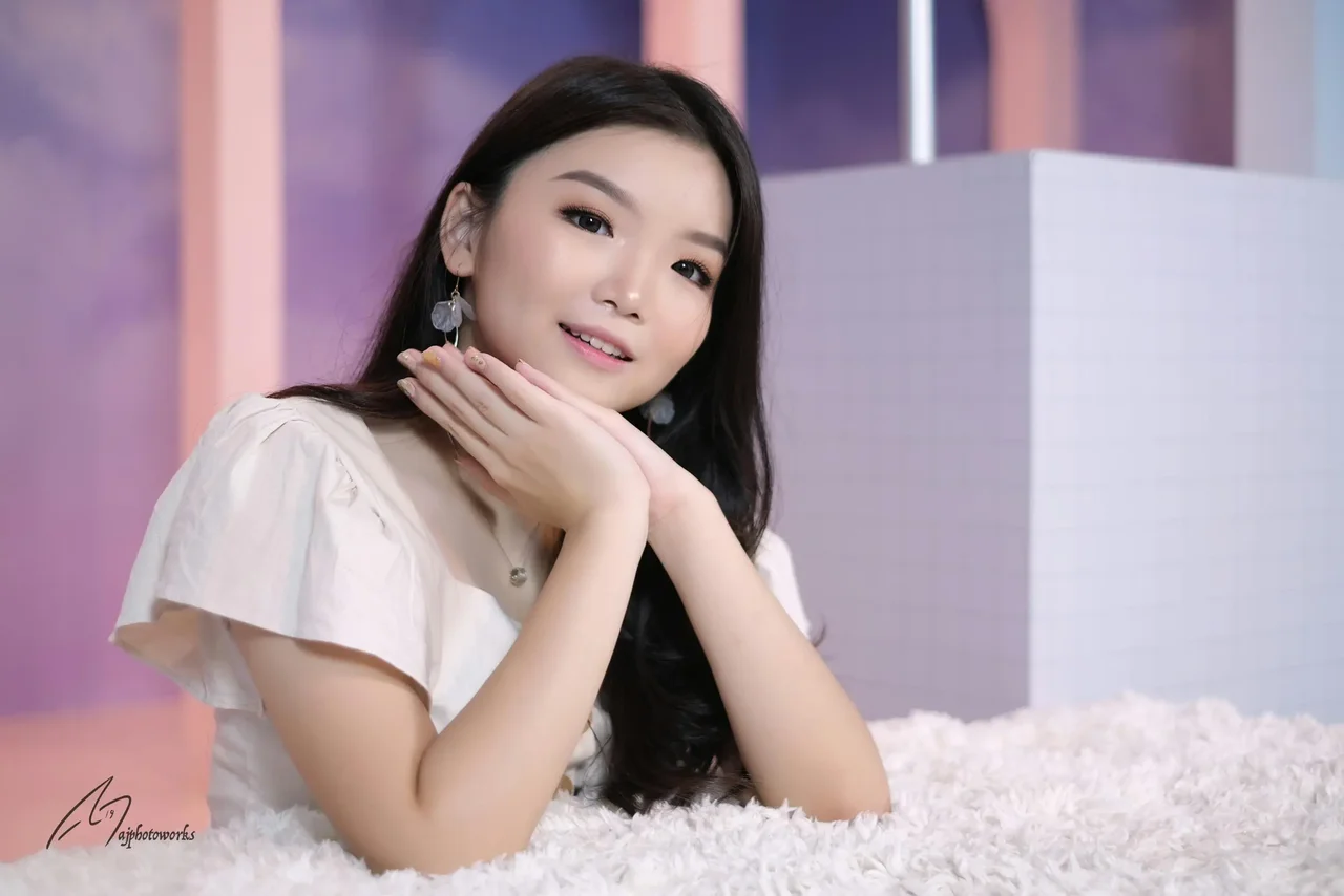 Elegance meets dreaminess in a fashion-forward studio portrait with soft textures and pastel hues.