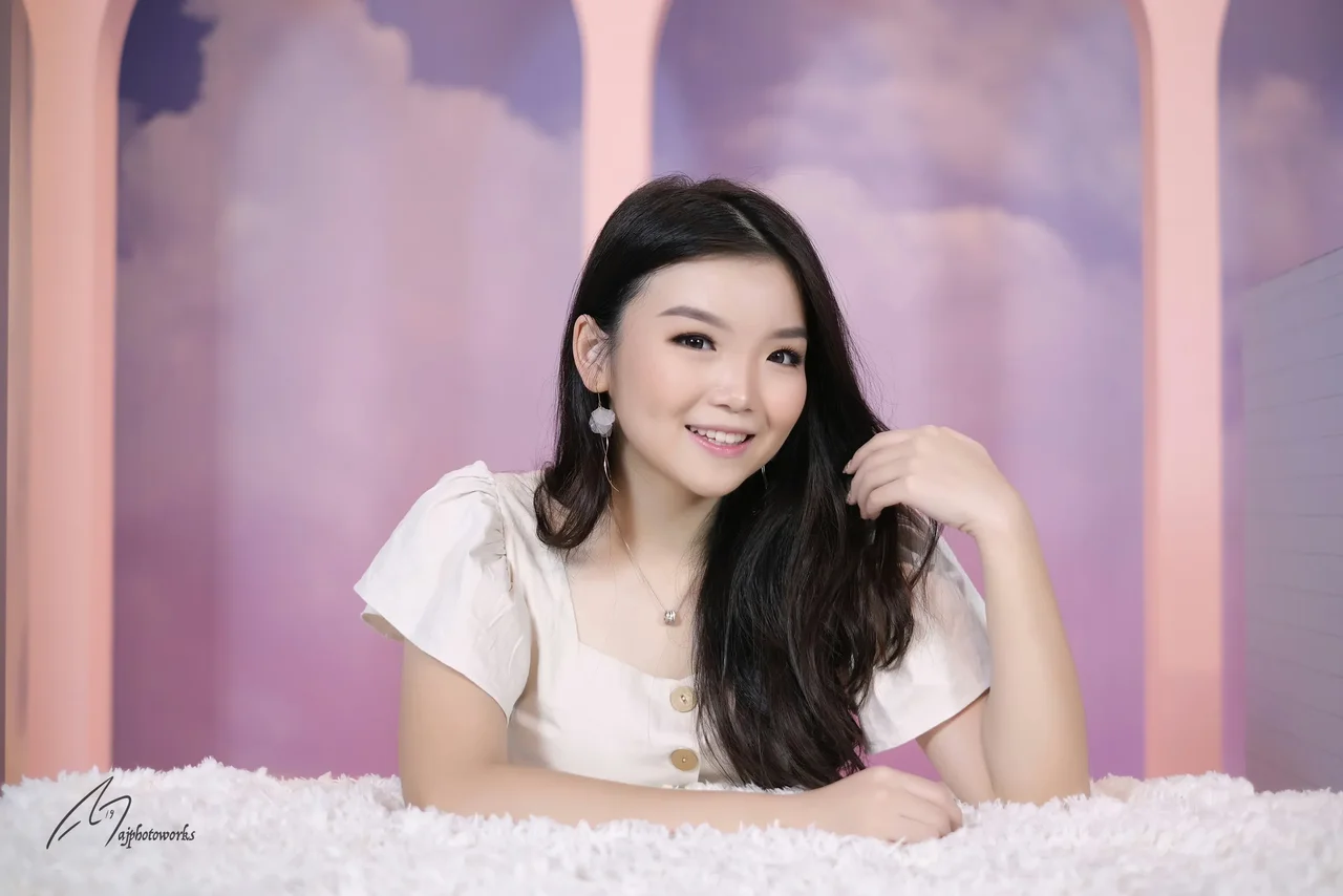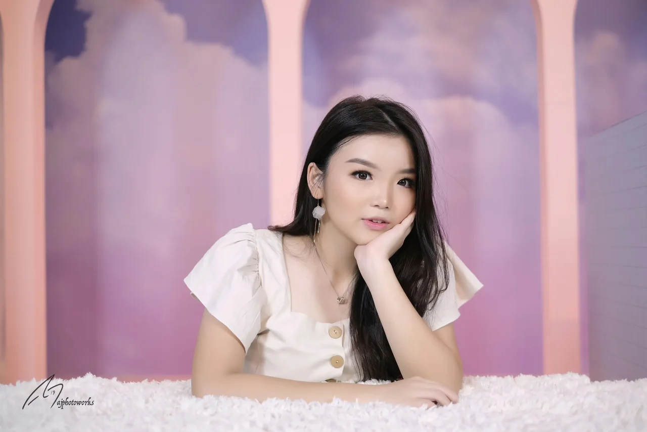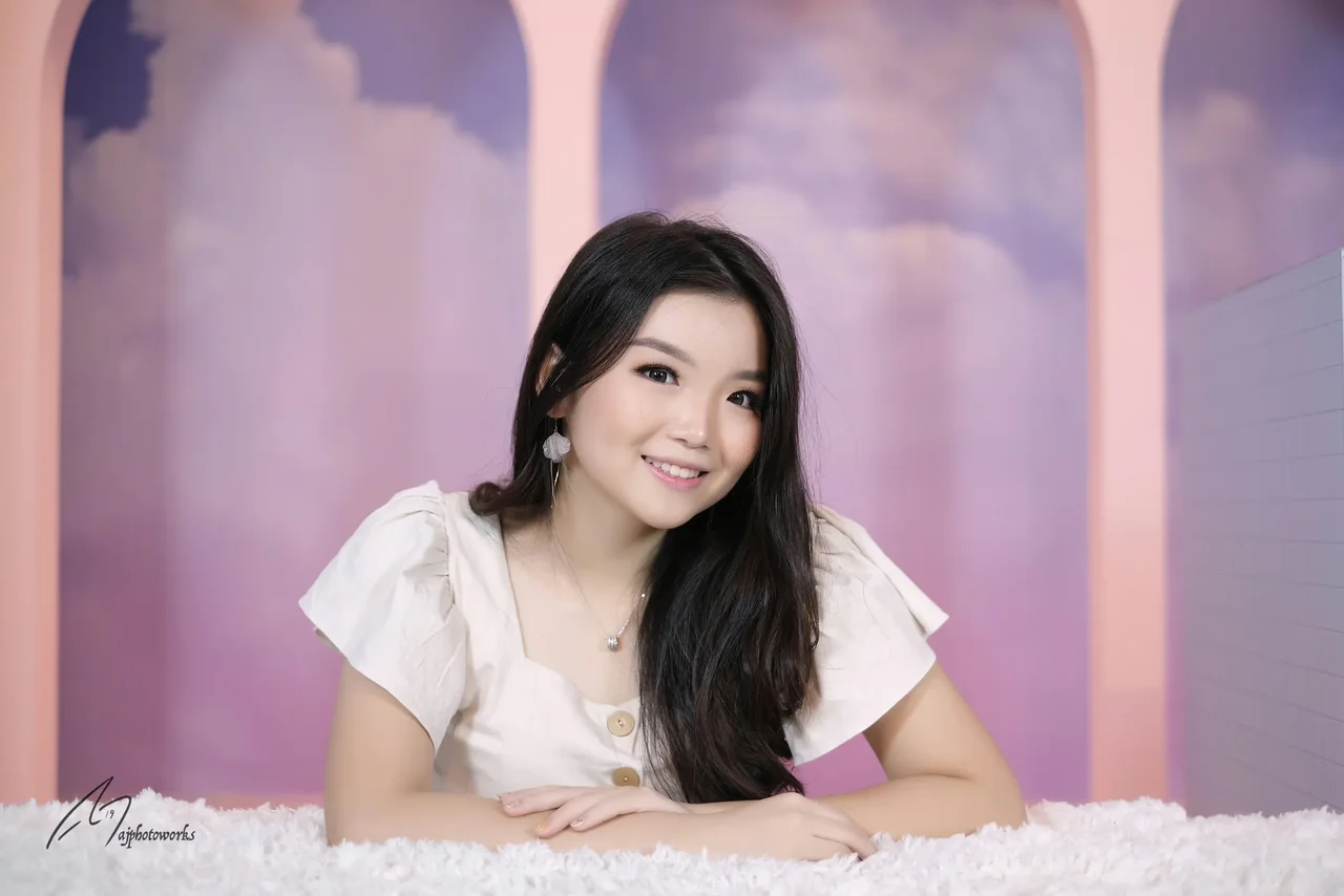A woman in a pink floral dress and white shaggy rug sitting on the ground against a colorful wall with pink stripes and white clouds with trees in the background.