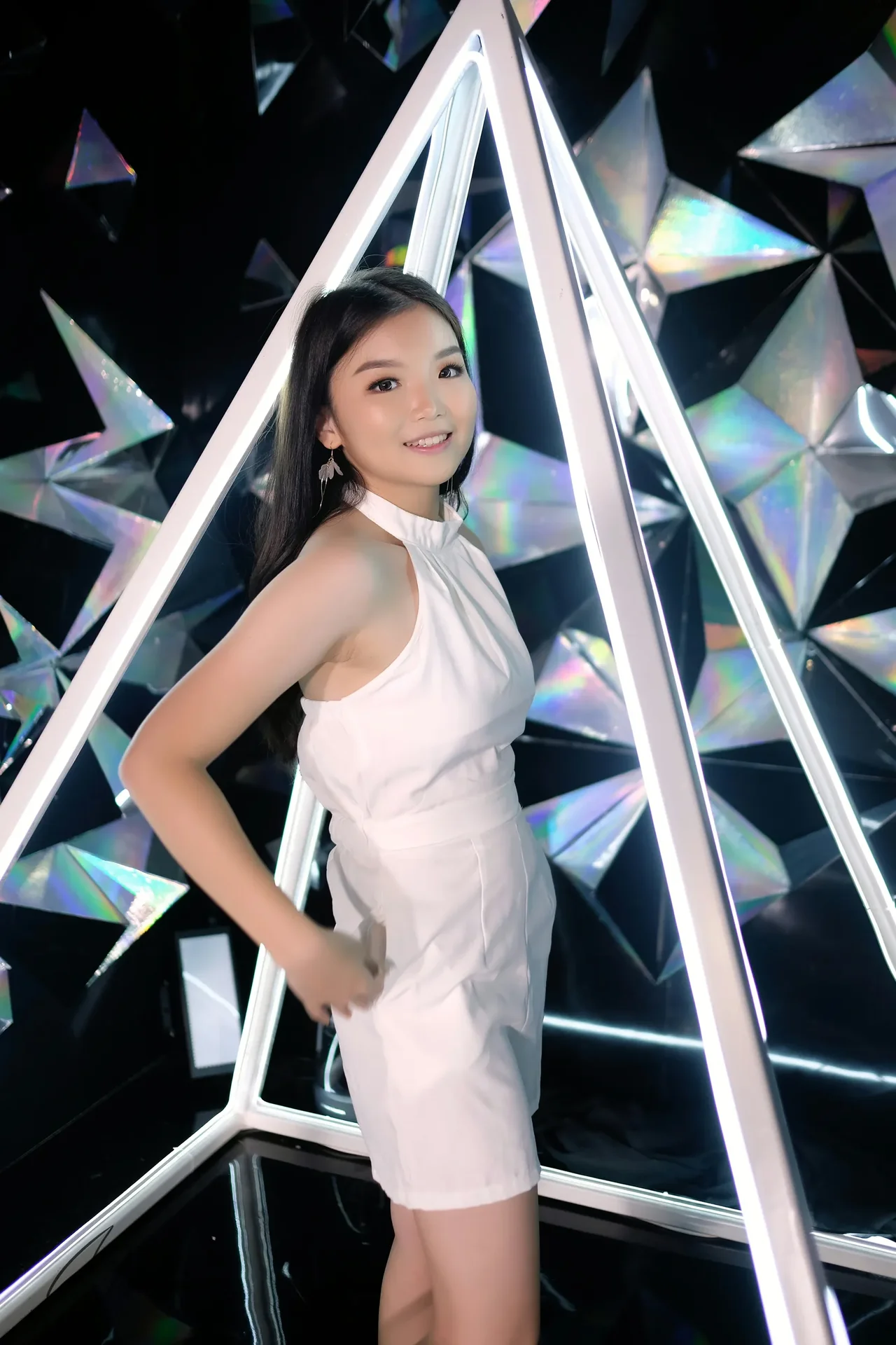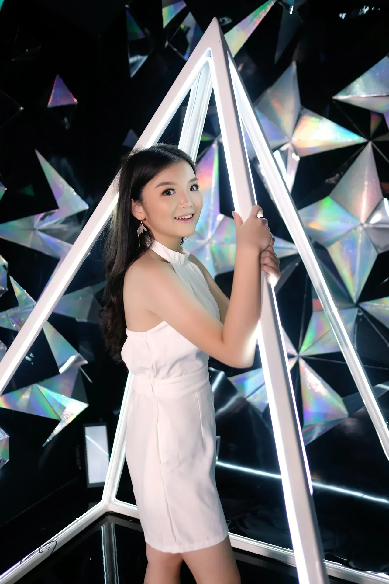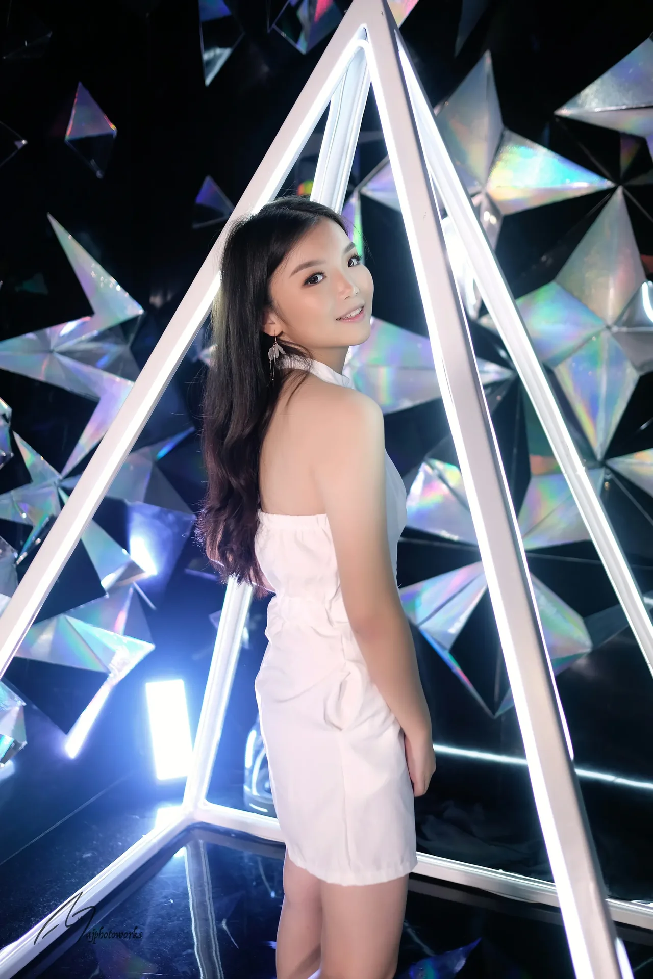 White bodysuit and skirt against neon-geometric backdrop: Modern fashion editorial with vibrant neon lighting.