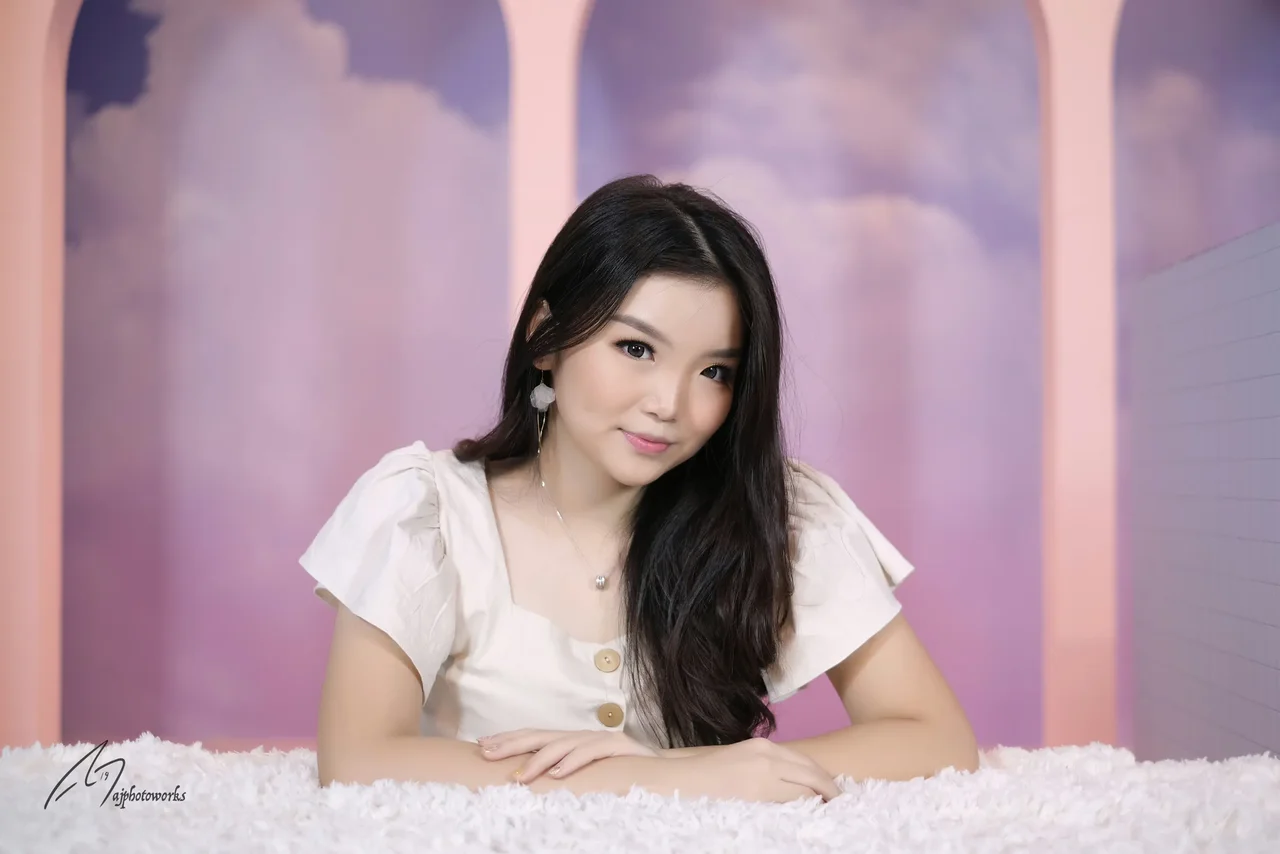 Elegant portrait against a dreamy pink and purple backdrop, blending soft textures with bold fashion.