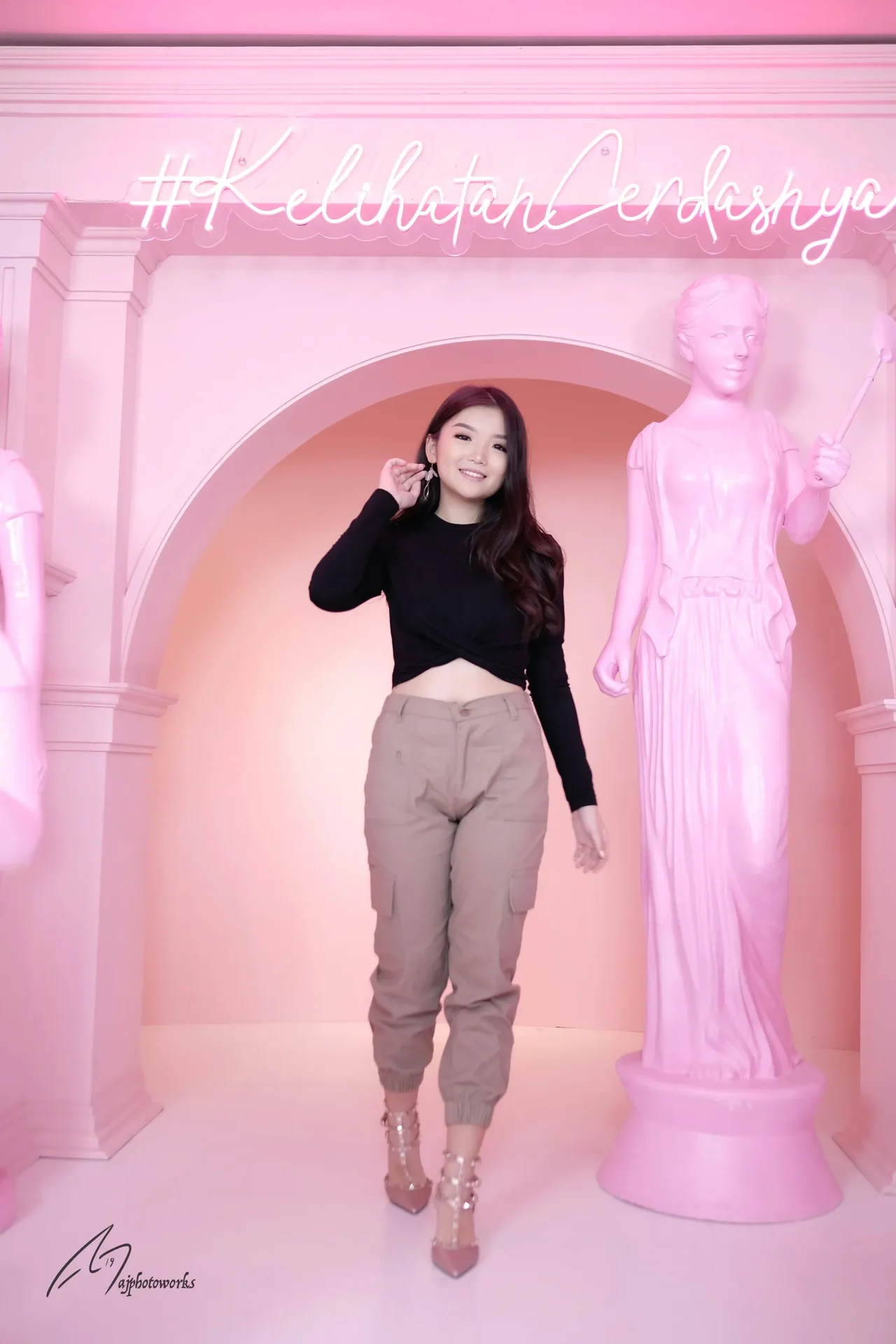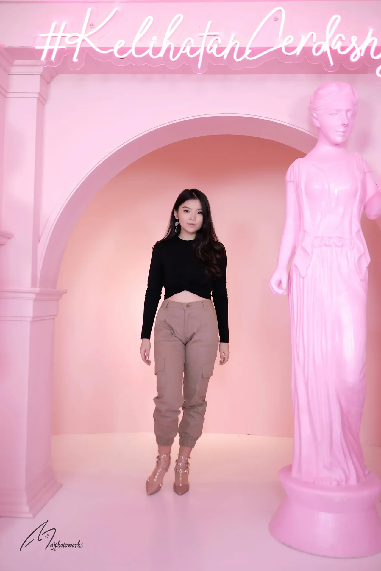 A woman poses inside a vibrant pink studio set, blending modern fashion with sculptural art and whimsical neon lighting.