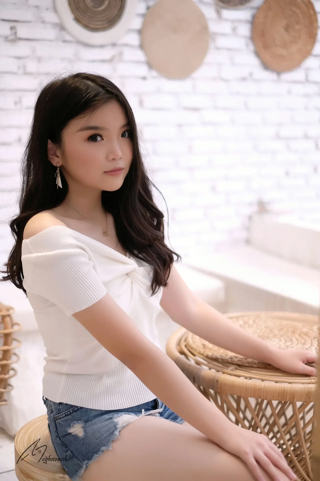Stylish white ripped top and blue denim shorts paired with delicate dangly earrings in a cozy café setting. A relaxed, warm-toned portrait capturing modern casual chic.