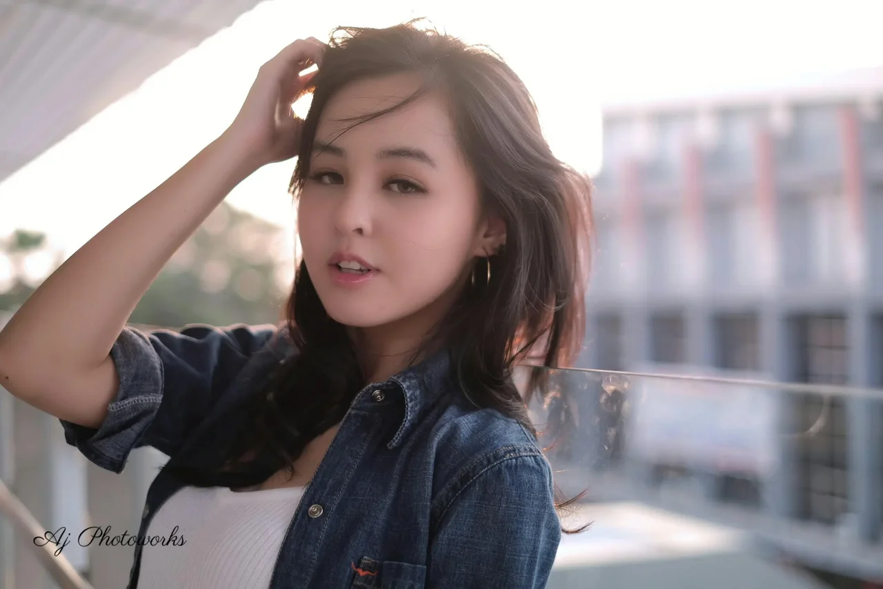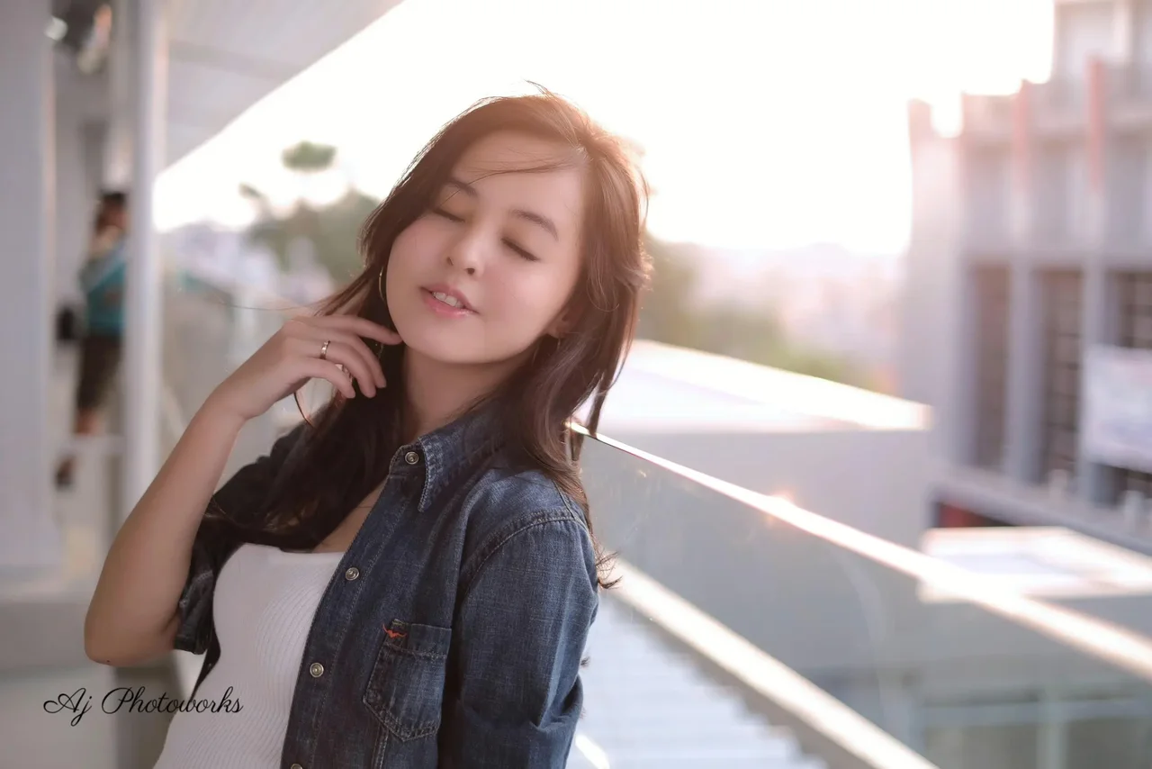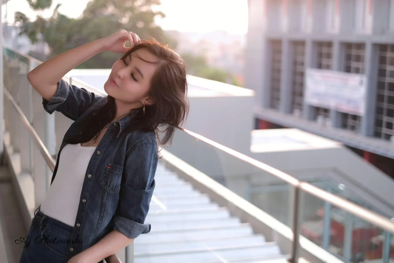A serene urban portrait capturing effortless style against the backdrop of a golden-hour rooftop.