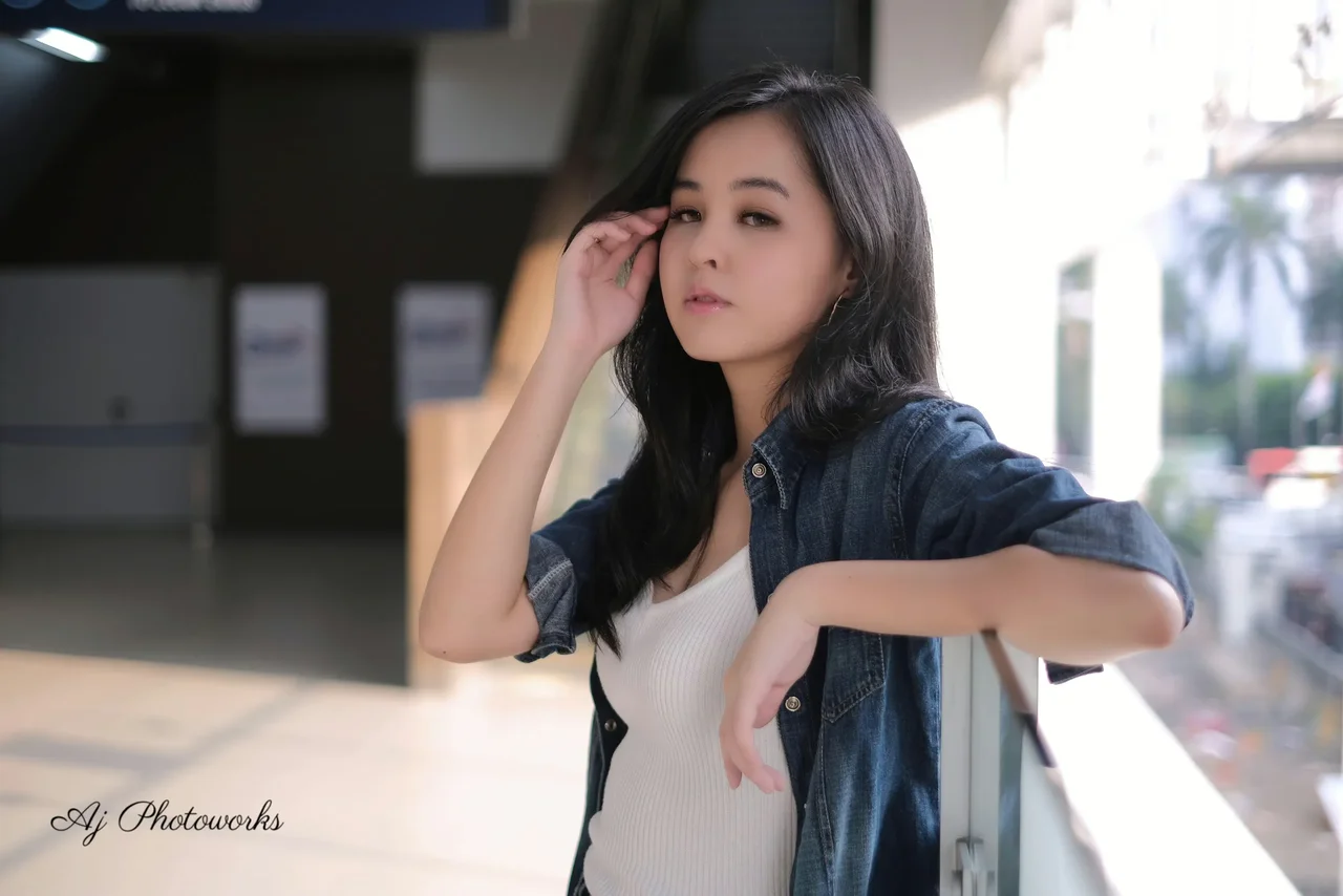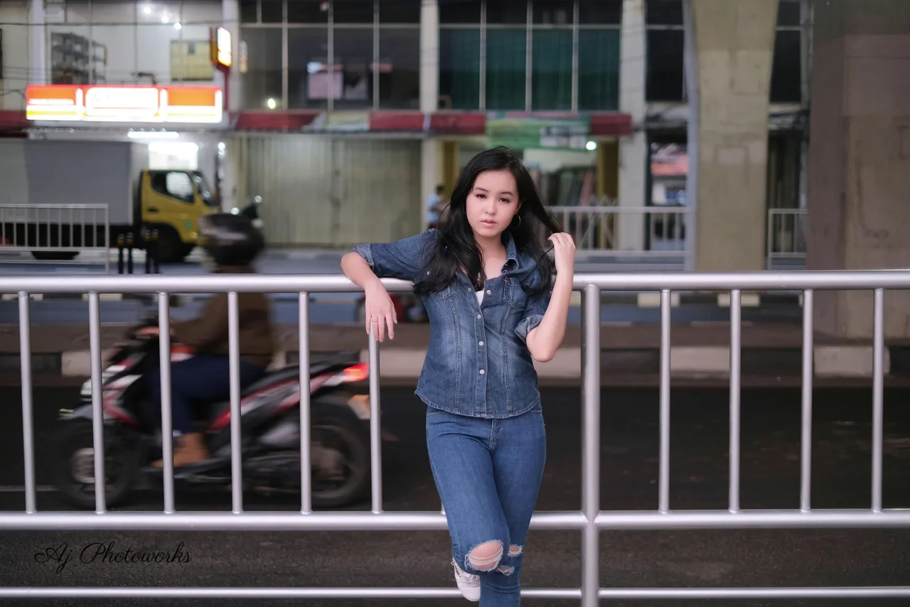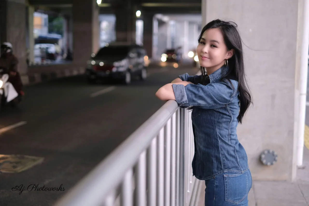 Urban Elegance: A modern woman in casual denim poses across dynamic cityscapes, capturing the vibrancy of urban life.