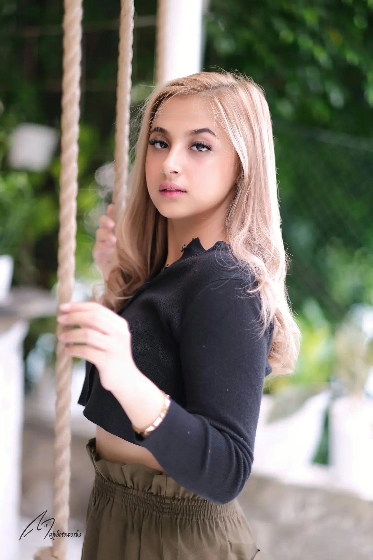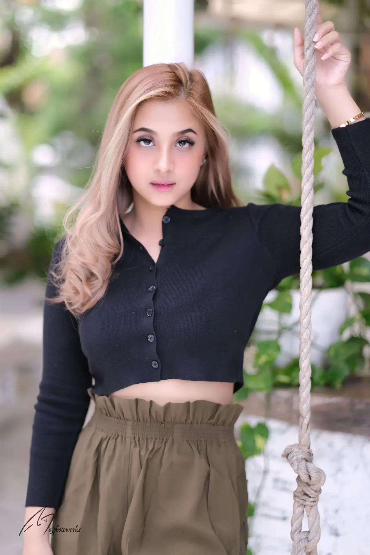 A captivating portrait of a woman in a chic black crop top and olive-green shorts, blending urban and natural elements with playful expressions and dynamic poses in a vibrant outdoor setting.