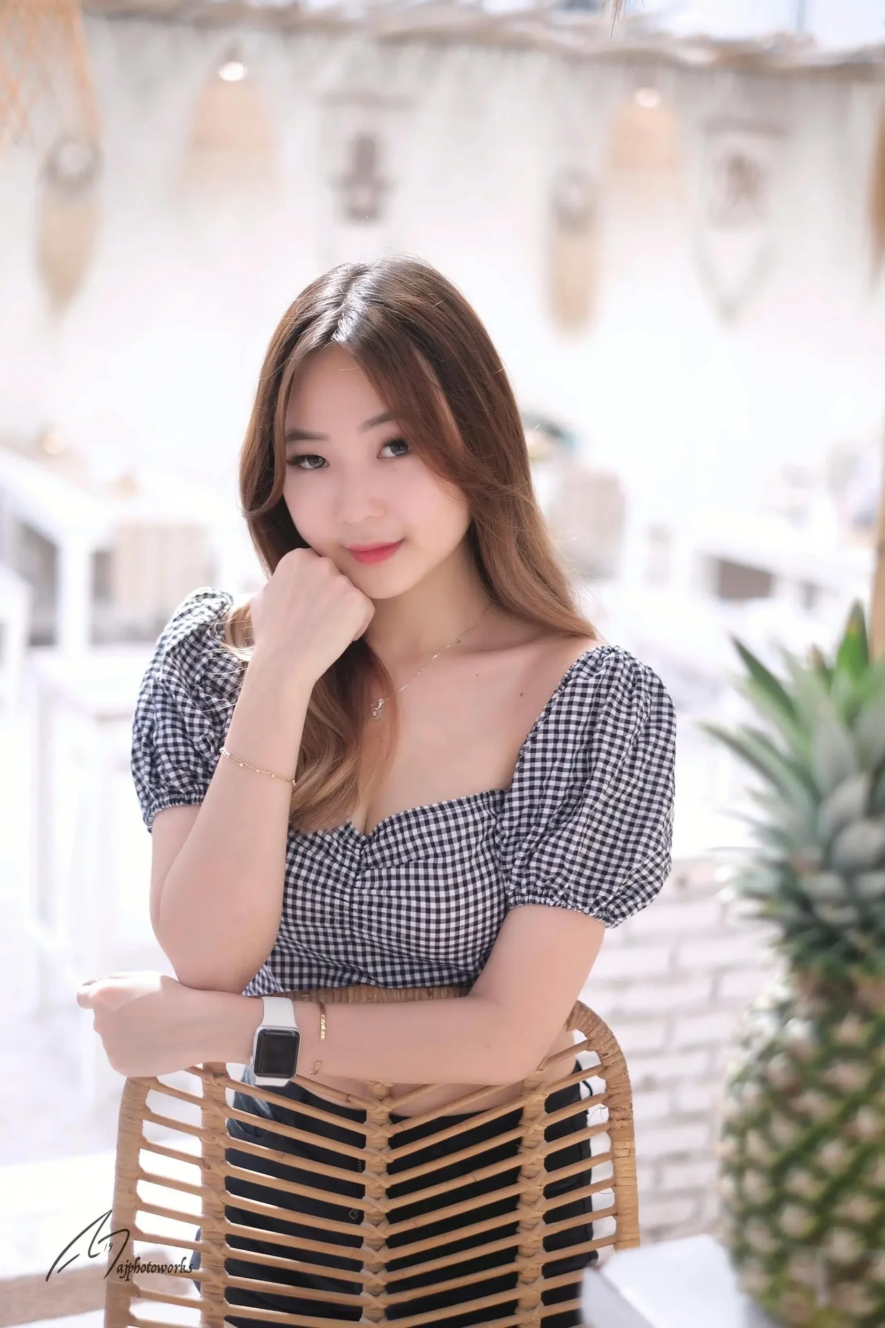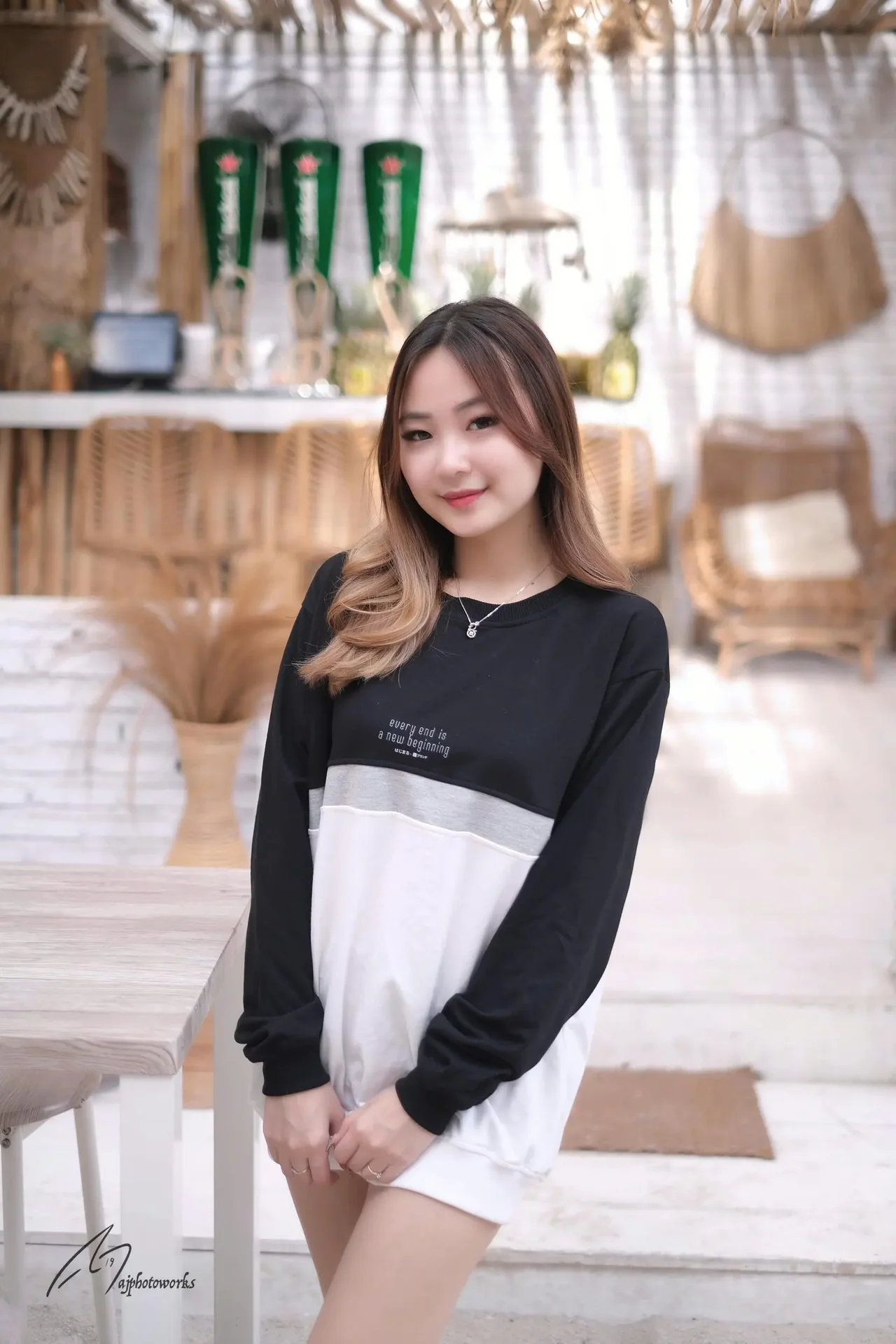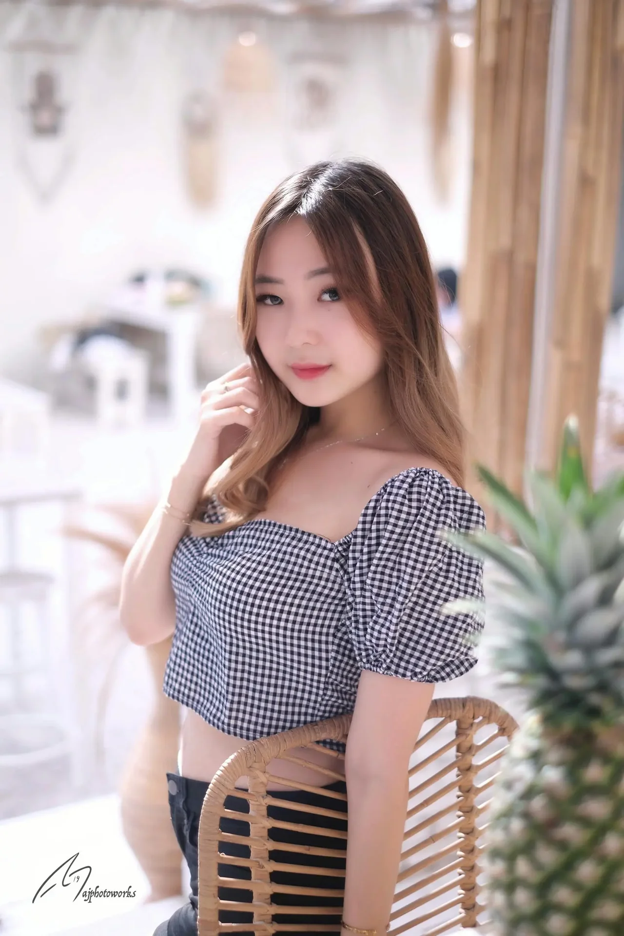 A young woman exudes casual elegance in a chic, bamboo-accented café-studio setting, showcasing stylish outfits under natural light.