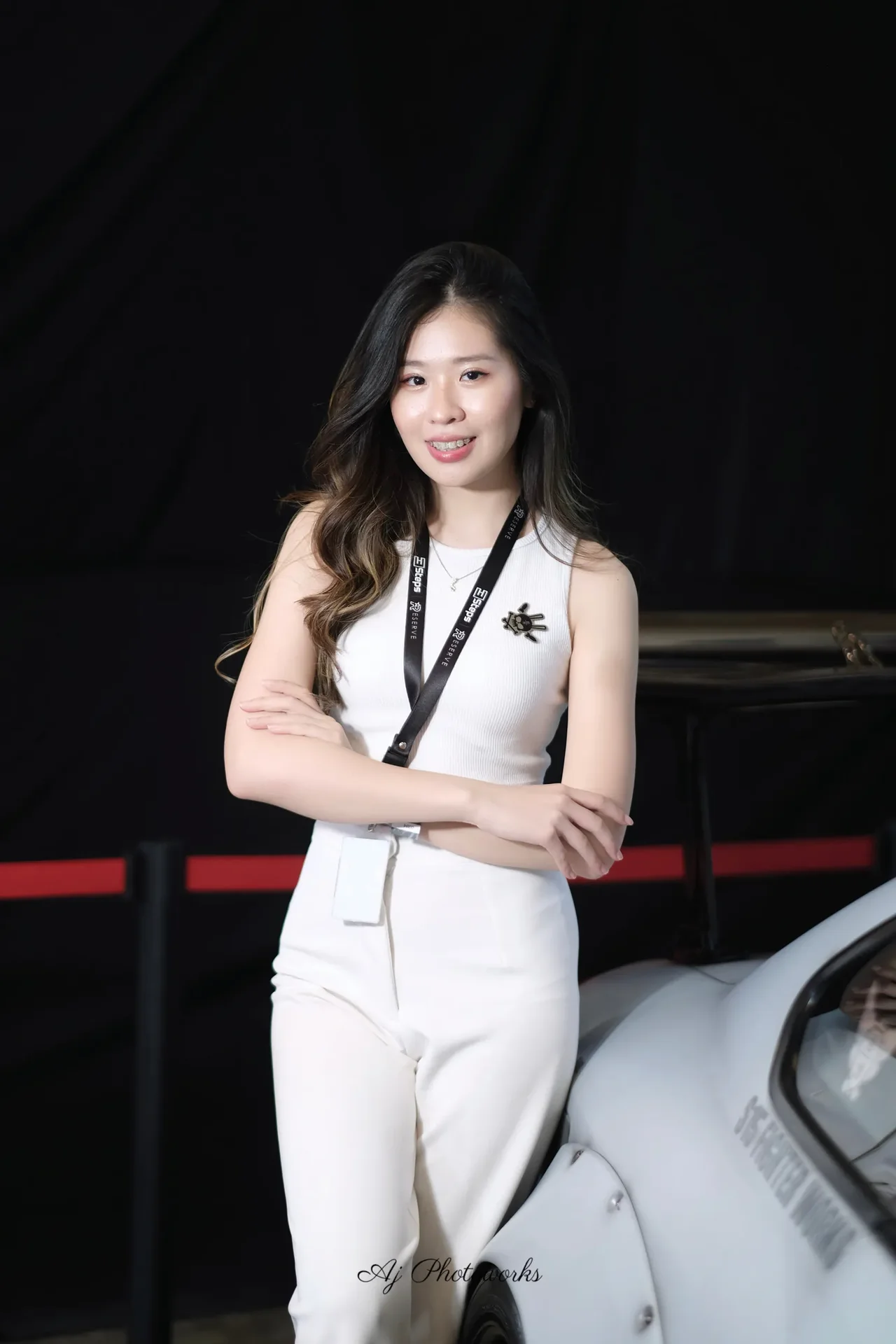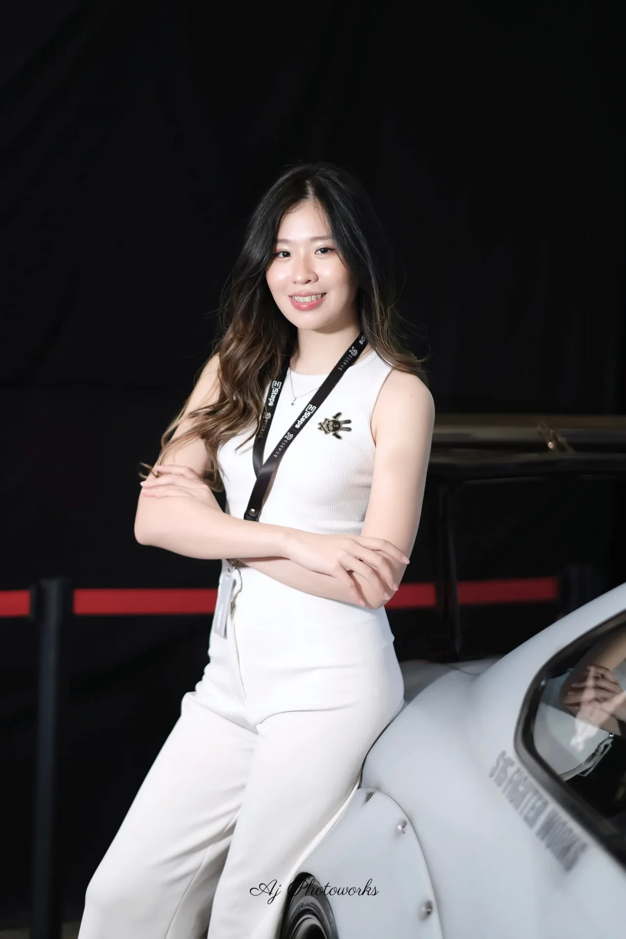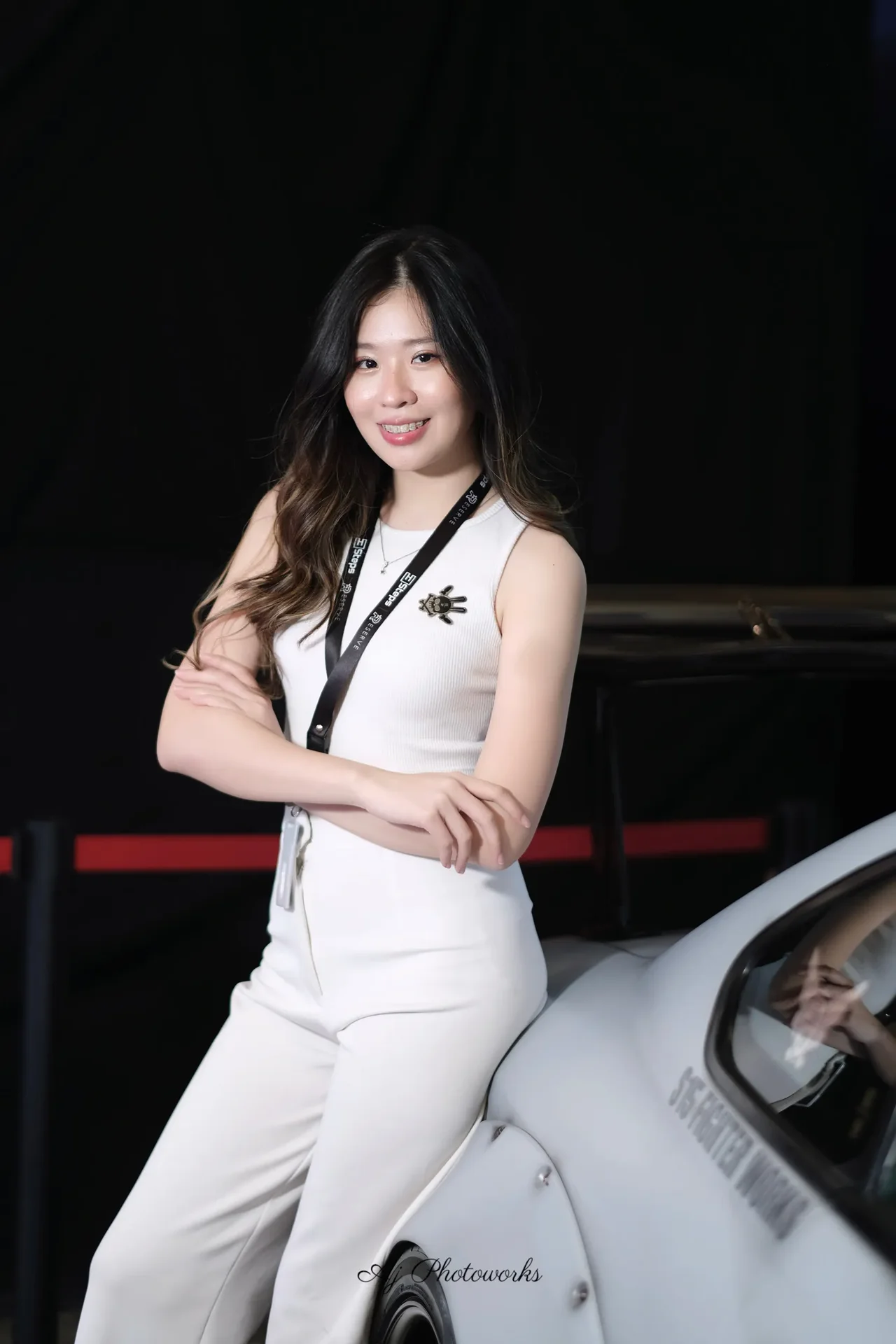 A confident portrait of a woman in white attire standing beside a car with studio lighting