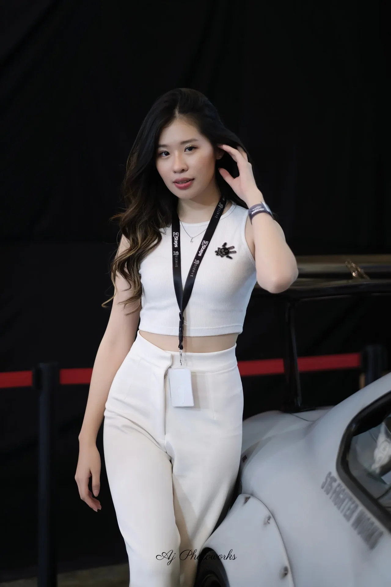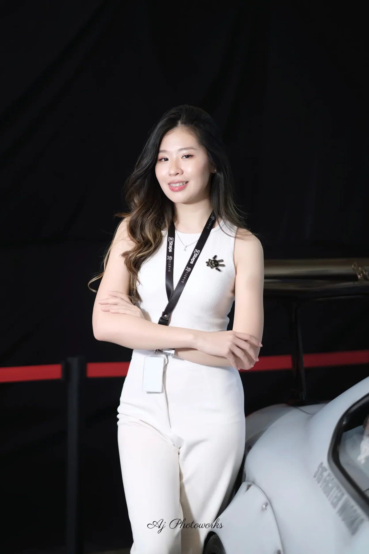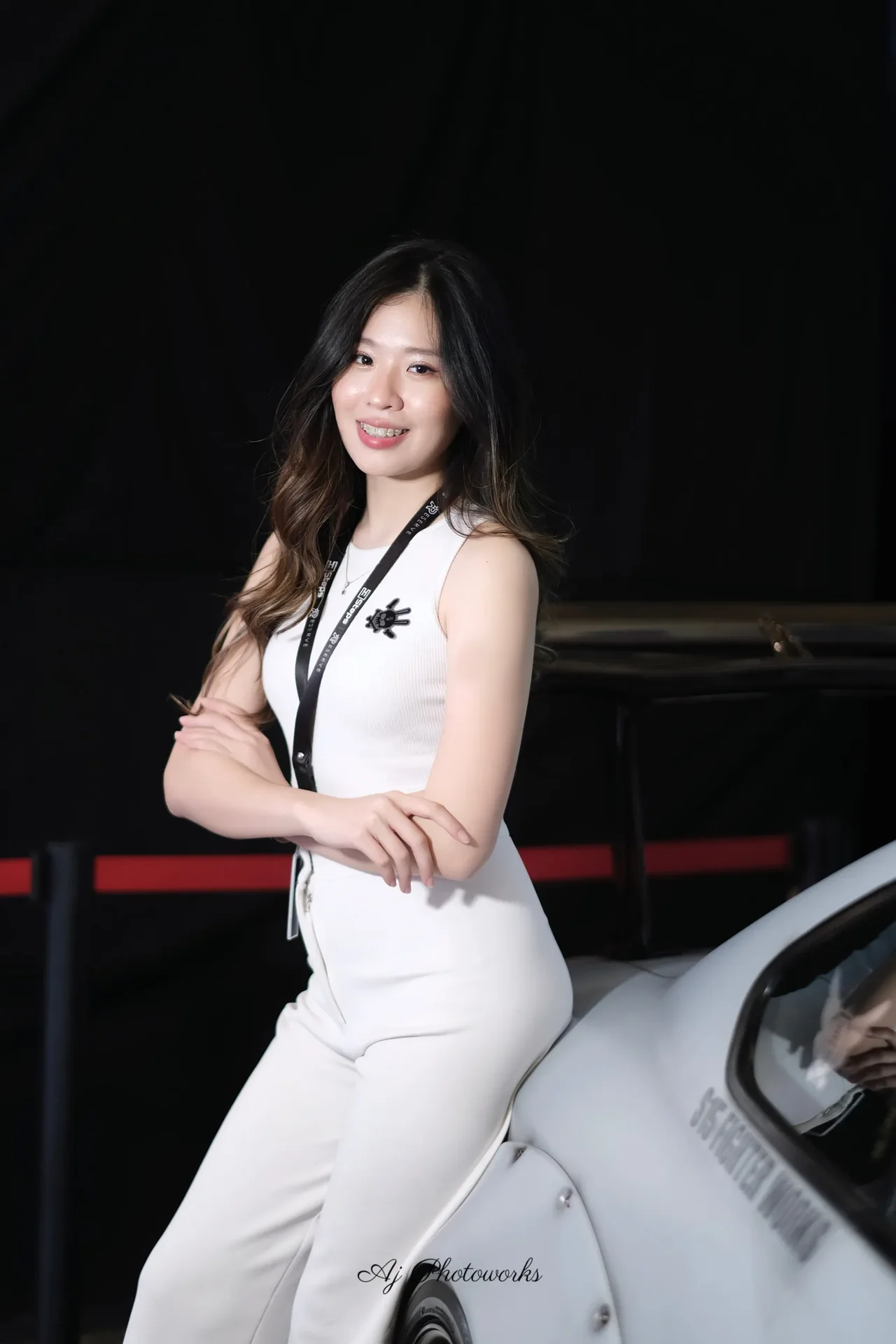 A confident portrait of a woman in white attire standing beside a car with studio lighting