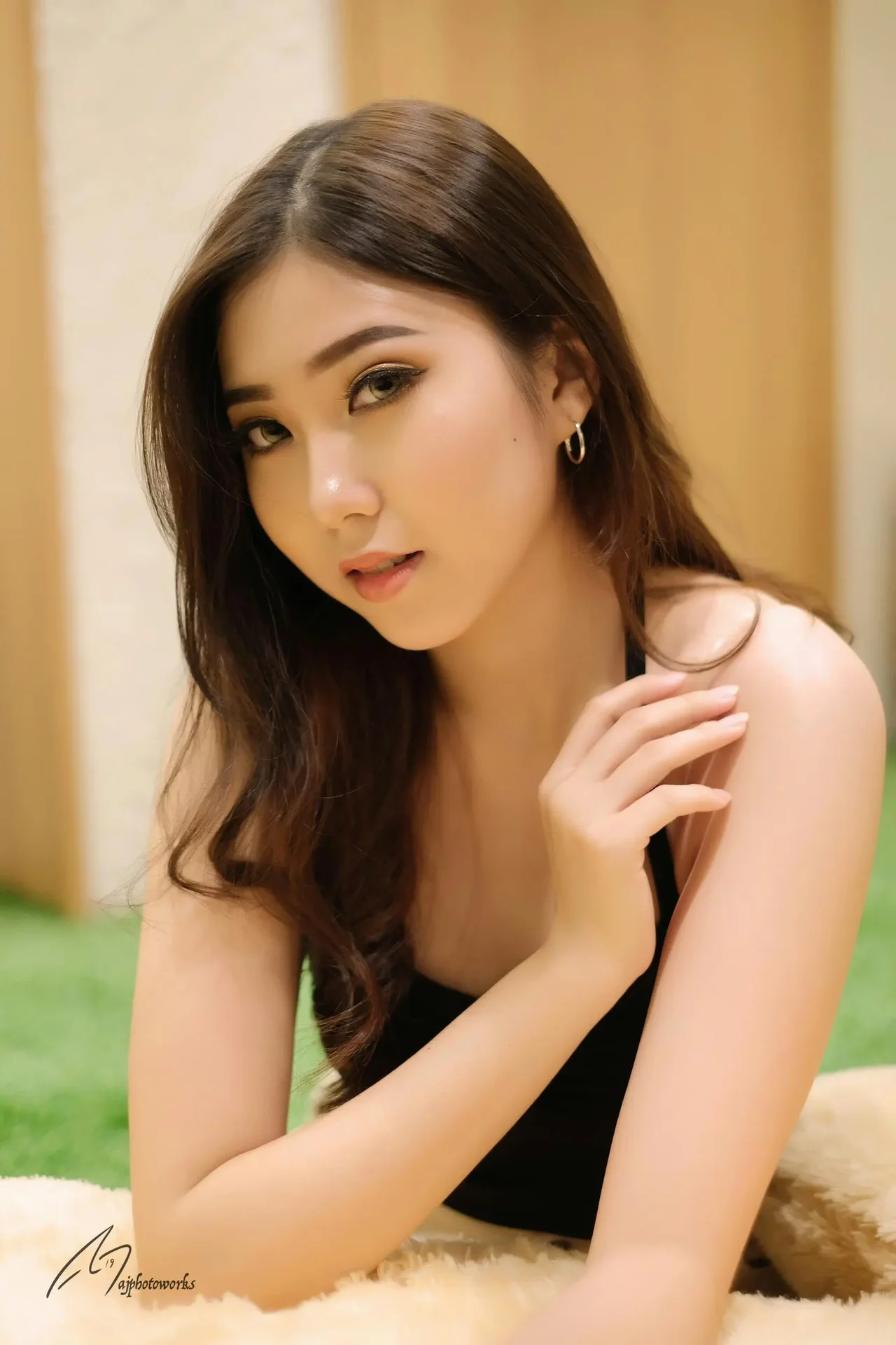 A woman posing playfully on a plush toy in a cozy studio setting, blending casual chic with soft natural light and warm tones.