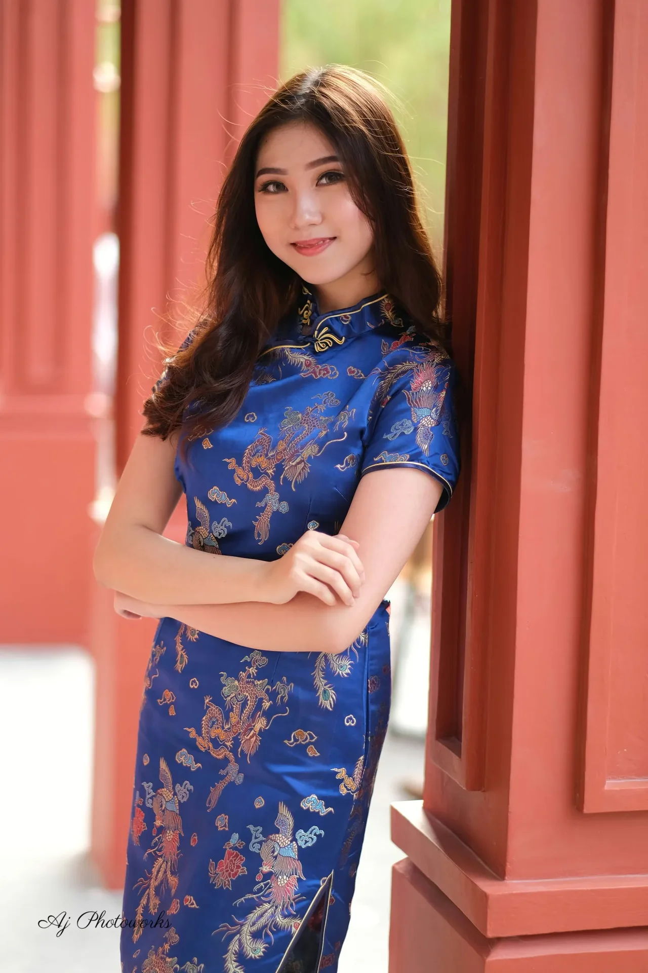 Elegance in motion: A woman in a vibrant blue silk qipao adorned with golden dragon motifs walks past terracotta columns, clutching a matching blue parasol under soft daylight.