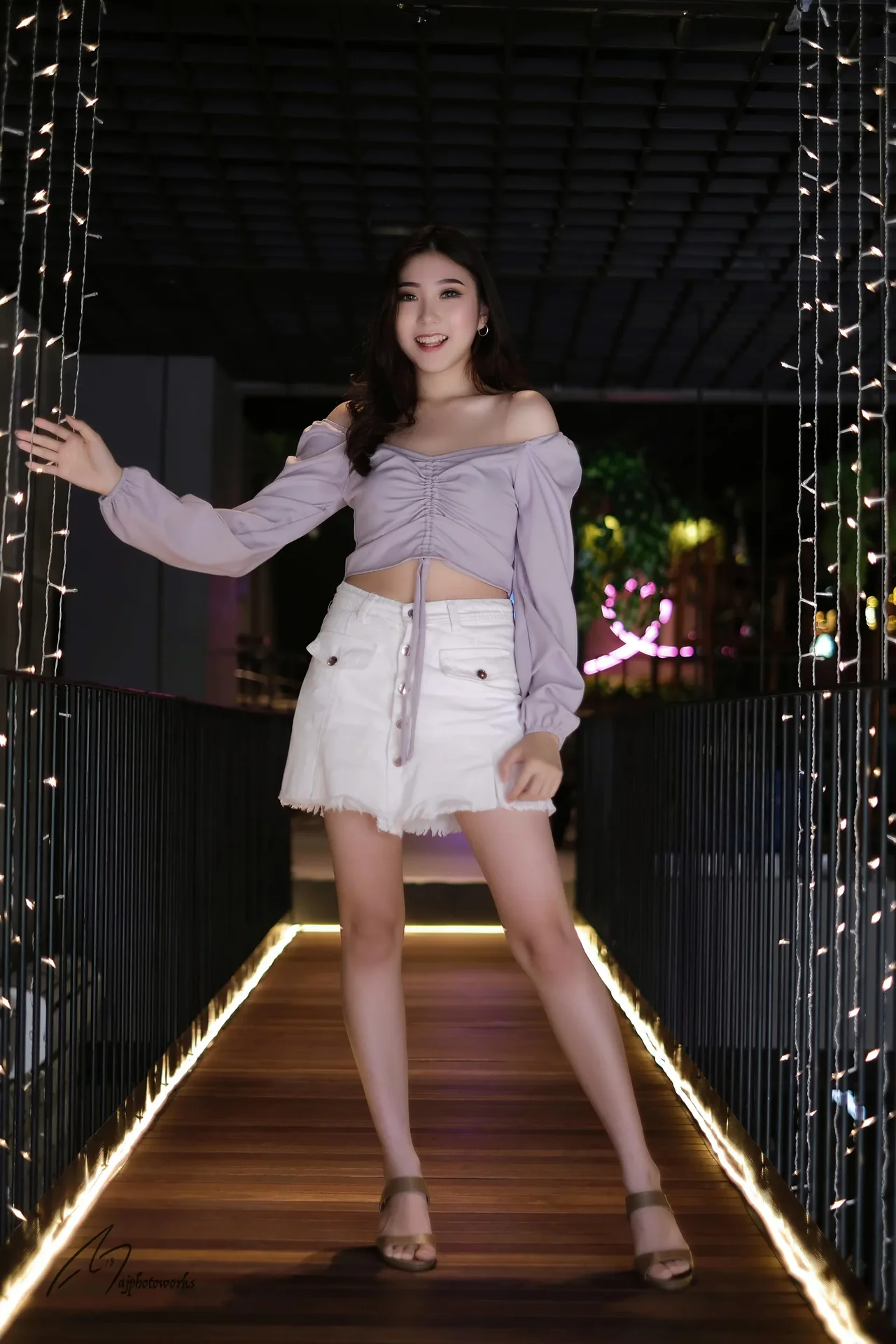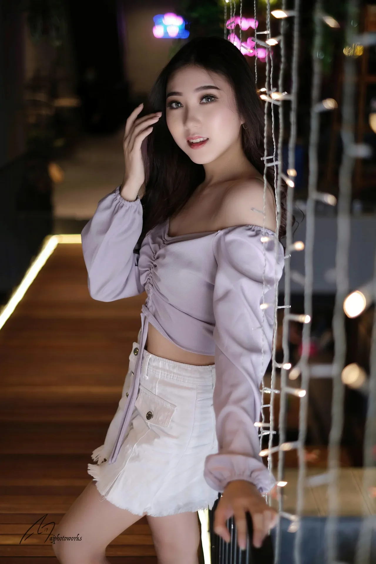 Elegant evening ensemble with a mix of soft and vibrant lights, capturing urban charm and confident allure.