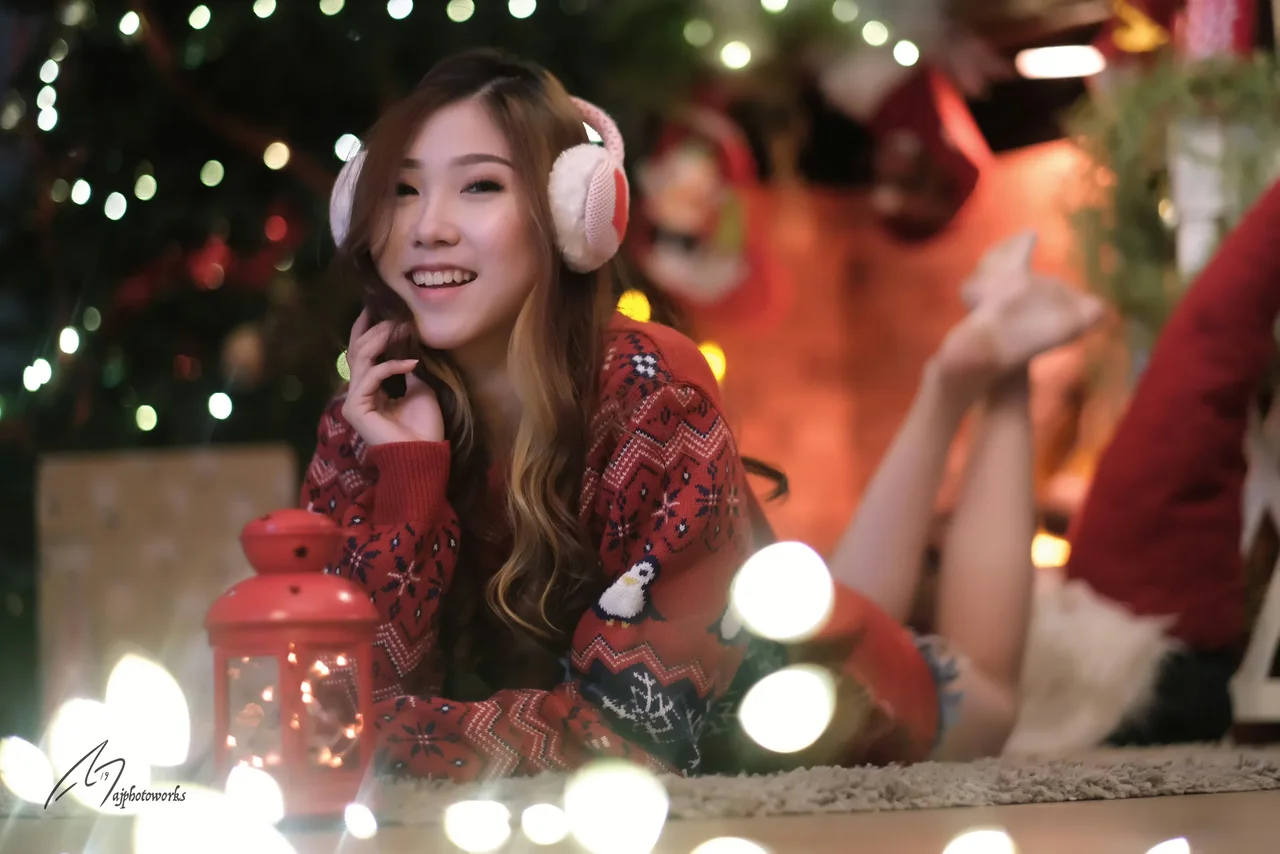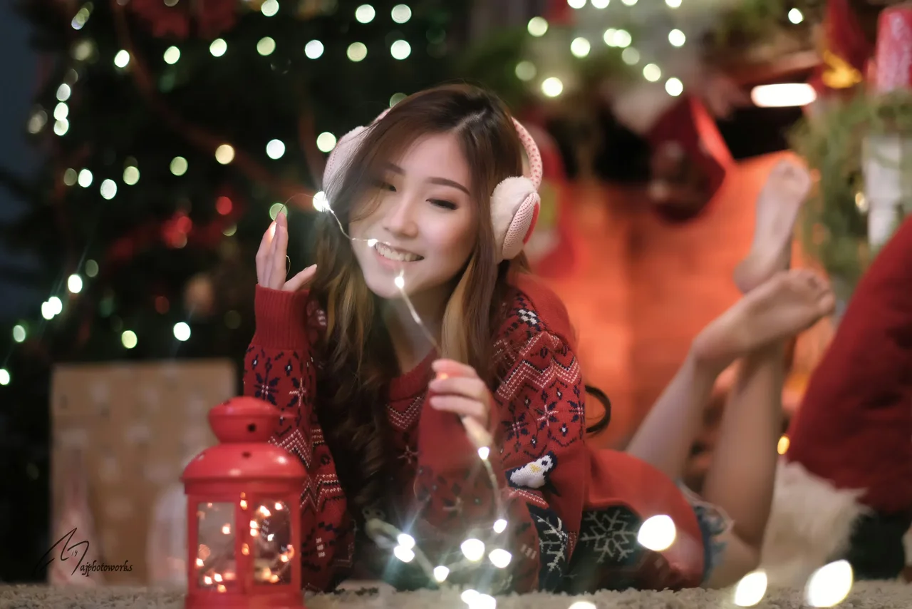 A festive scene of a woman relaxing in holiday attire by a Christmas tree illuminated with twinkling lights and a glowing red lantern, exuding warmth and cheer.