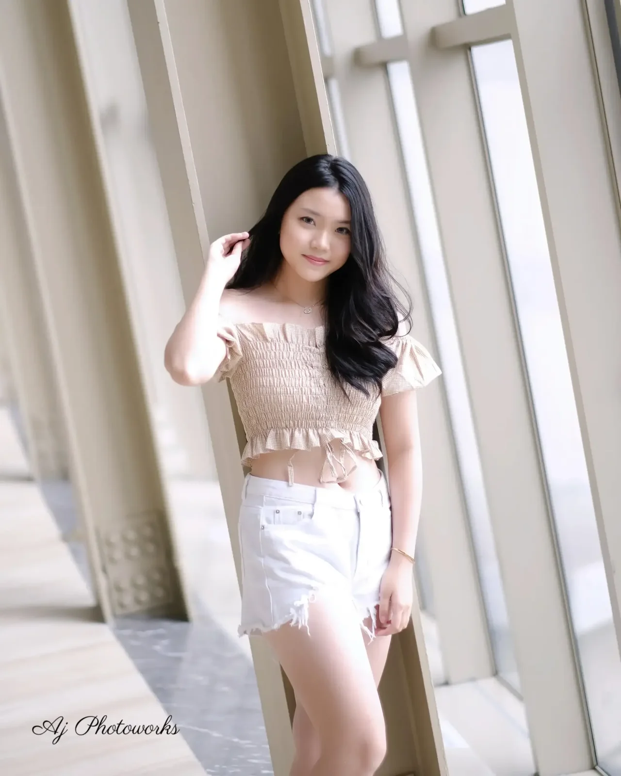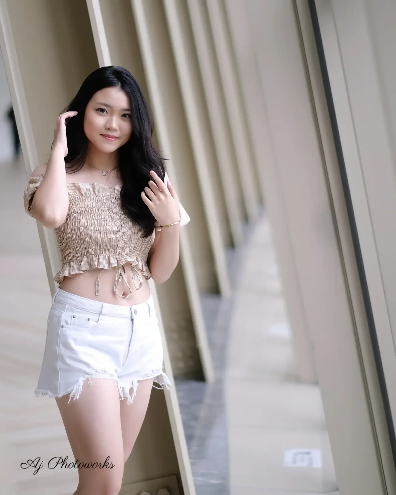 Elegant fashion portrait of a confident woman in a modern atrium space.