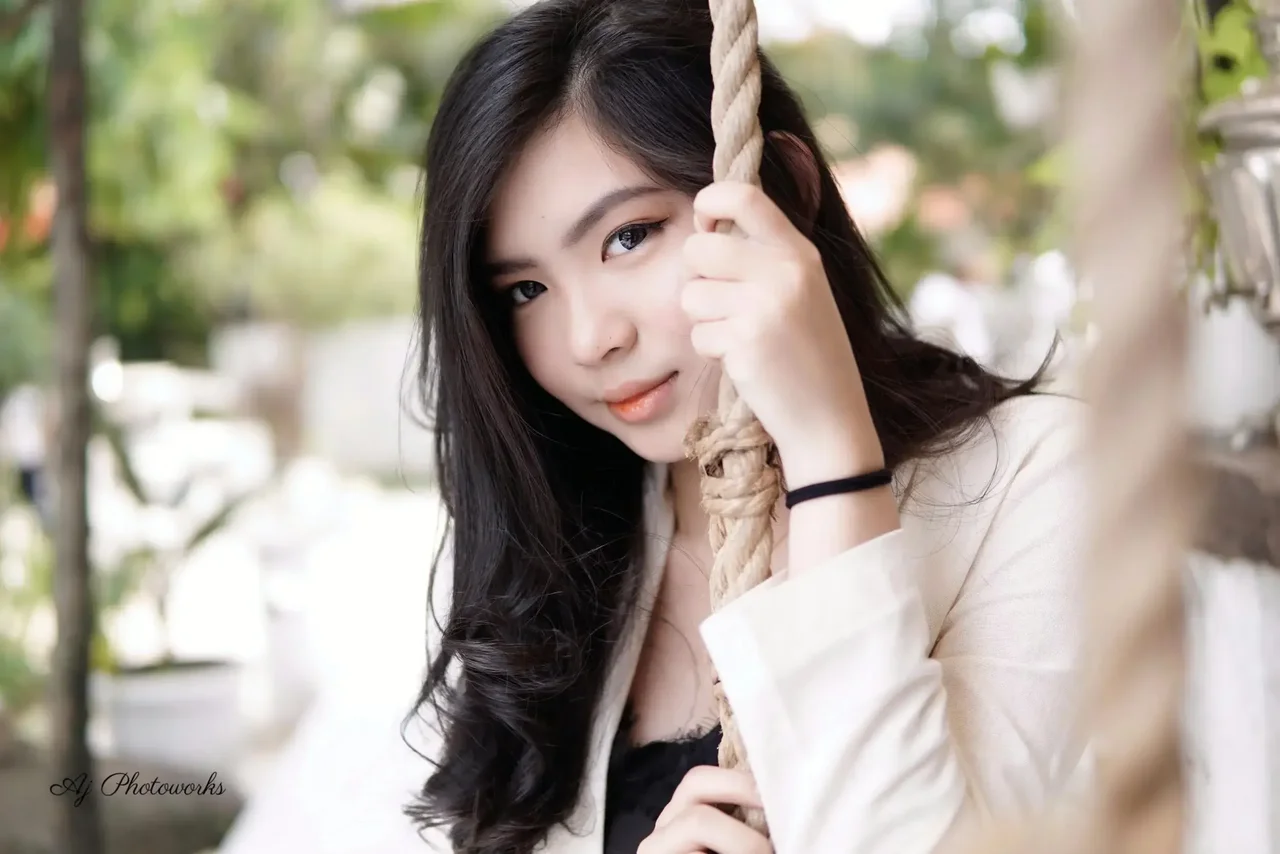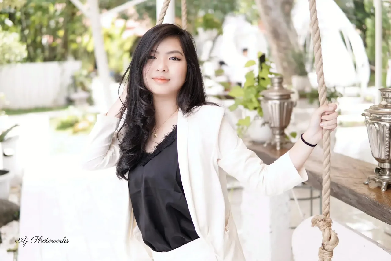Elegance meets simplicity: A serene outdoor portrait highlighting modern fashion against a sunlit patio backdrop.