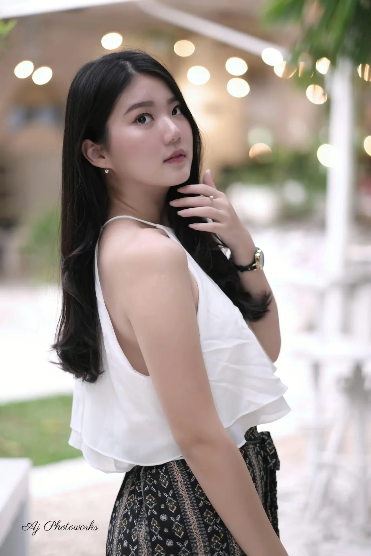 Elegance meets simplicity in this portrait capturing the model's poised stature against a softly lit outdoor courtyard.
