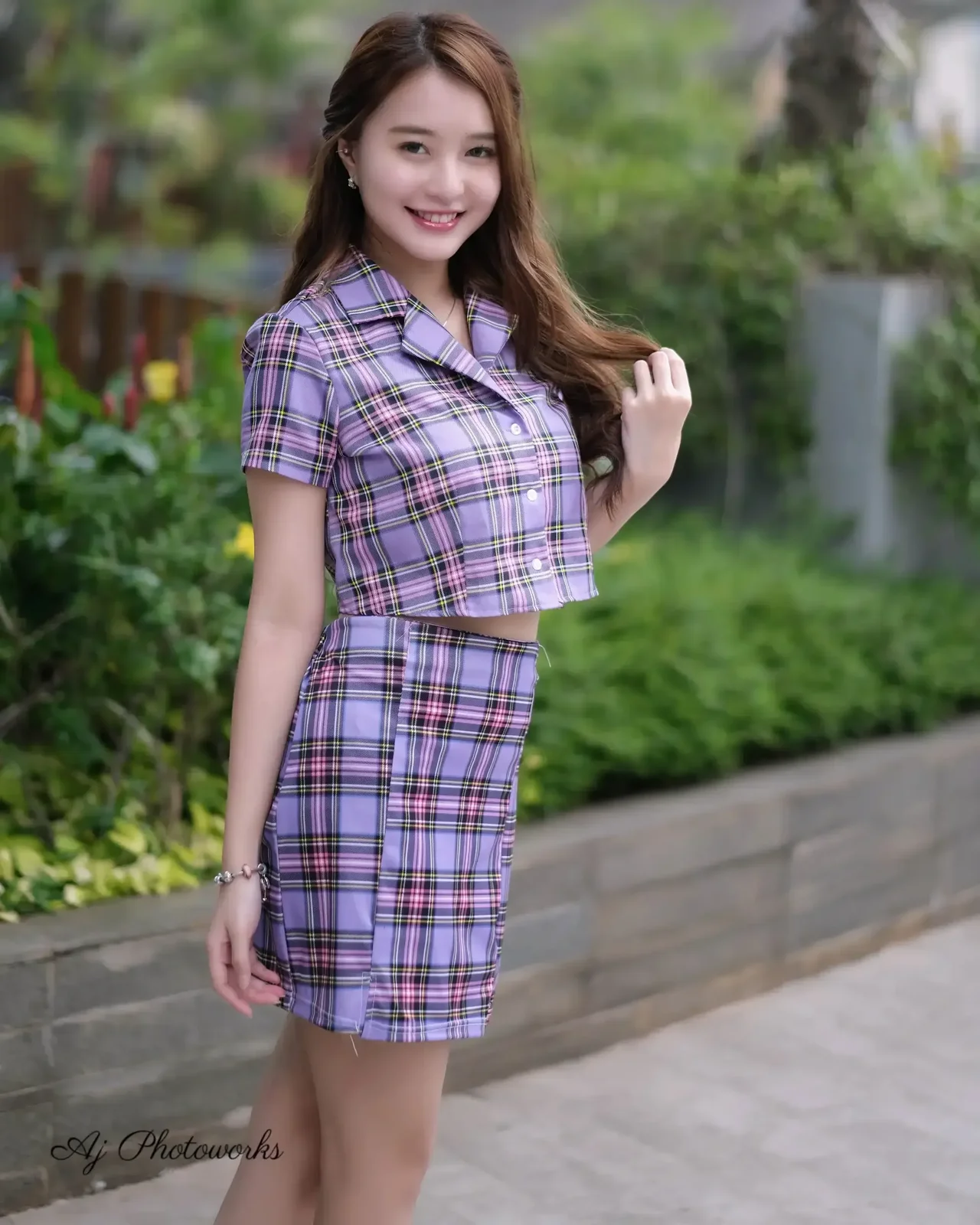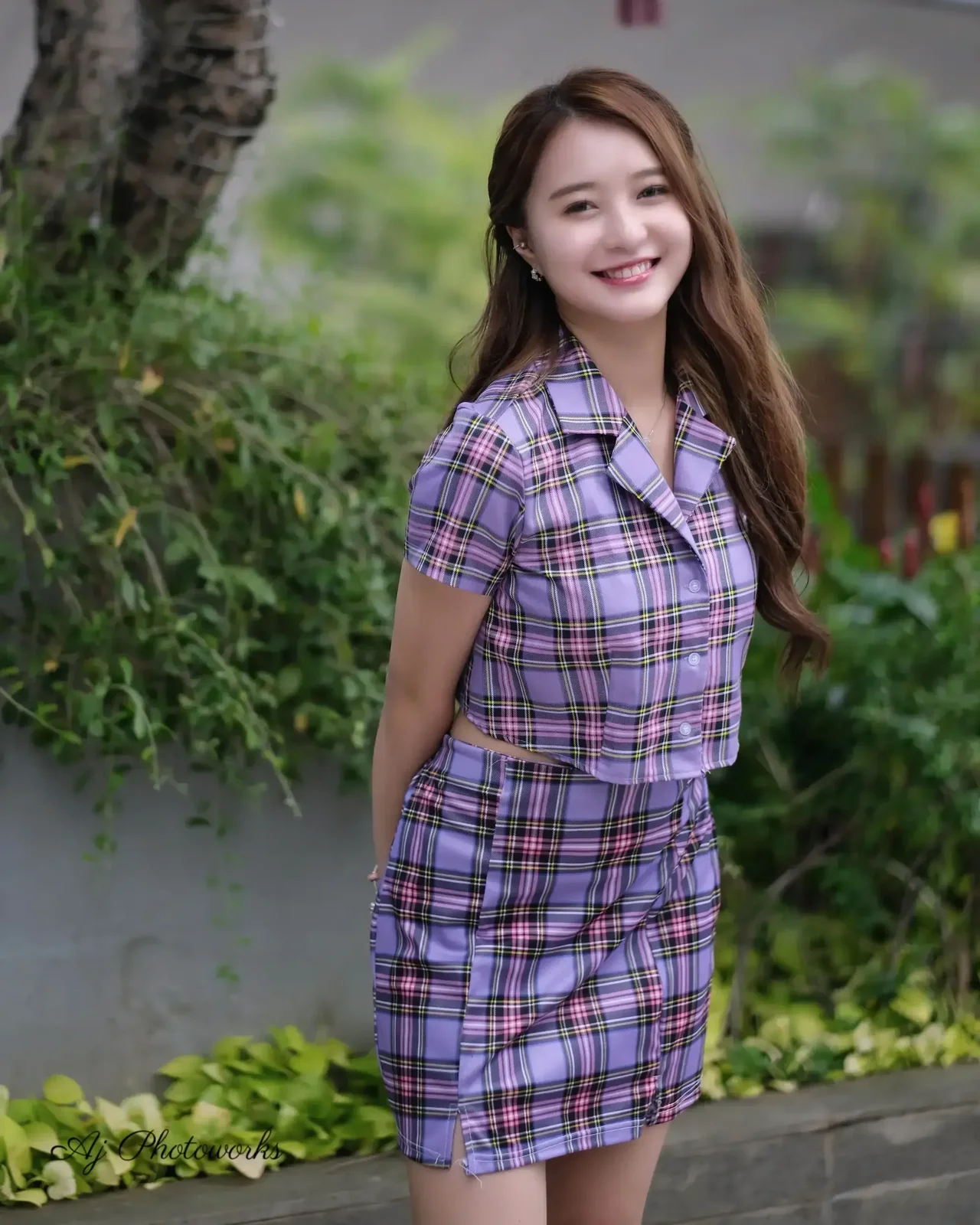 Cheerful portrait of a young woman in a vibrant plaid outfit set against a lush garden backdrop, showcasing a harmonious blend of urban casual wear and natural elements.