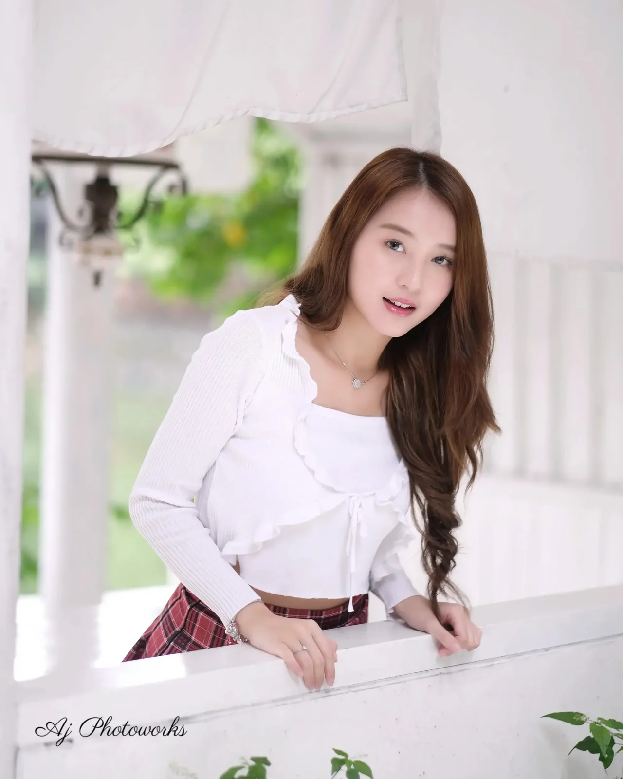 A woman confidently poses in stylish casual outfits, blending white blouses and plaid skirts amidst serene outdoor settings with soft natural lighting.