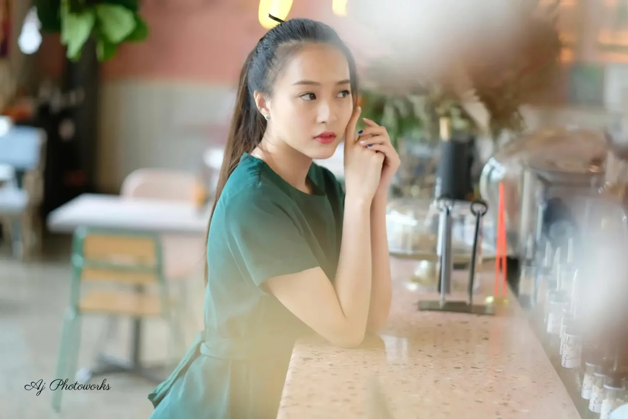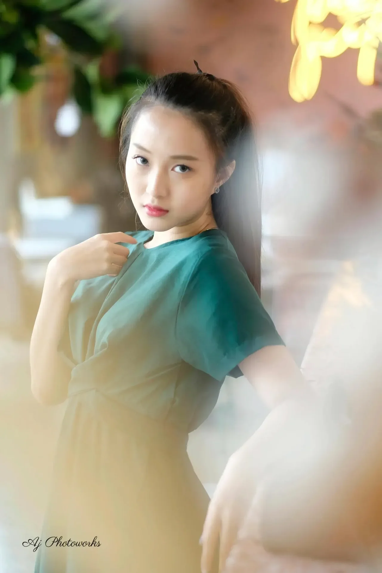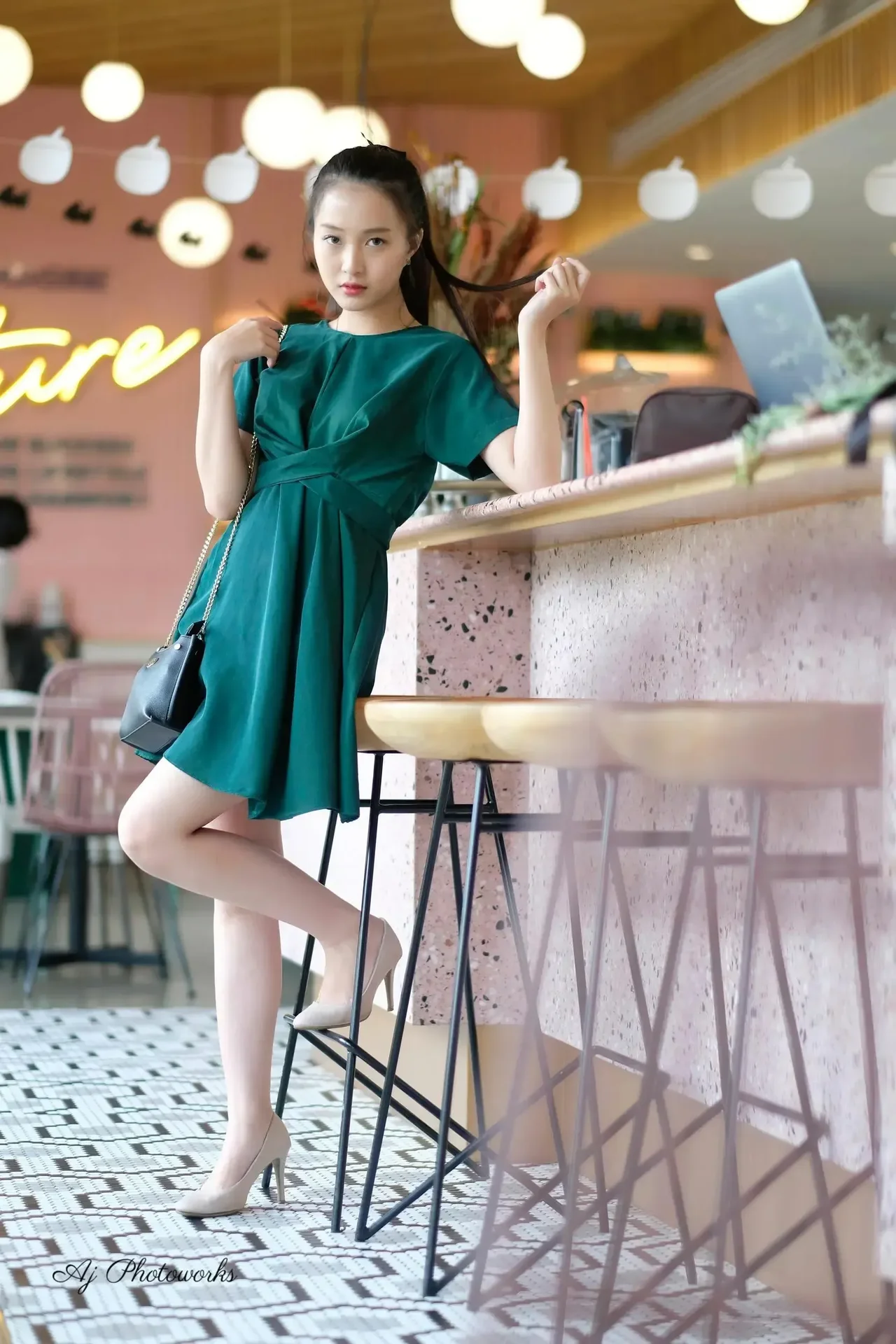 A model in a chic teal dress captured in a vibrant restaurant setting, blending elegance with modern style for a fashion editorial.
