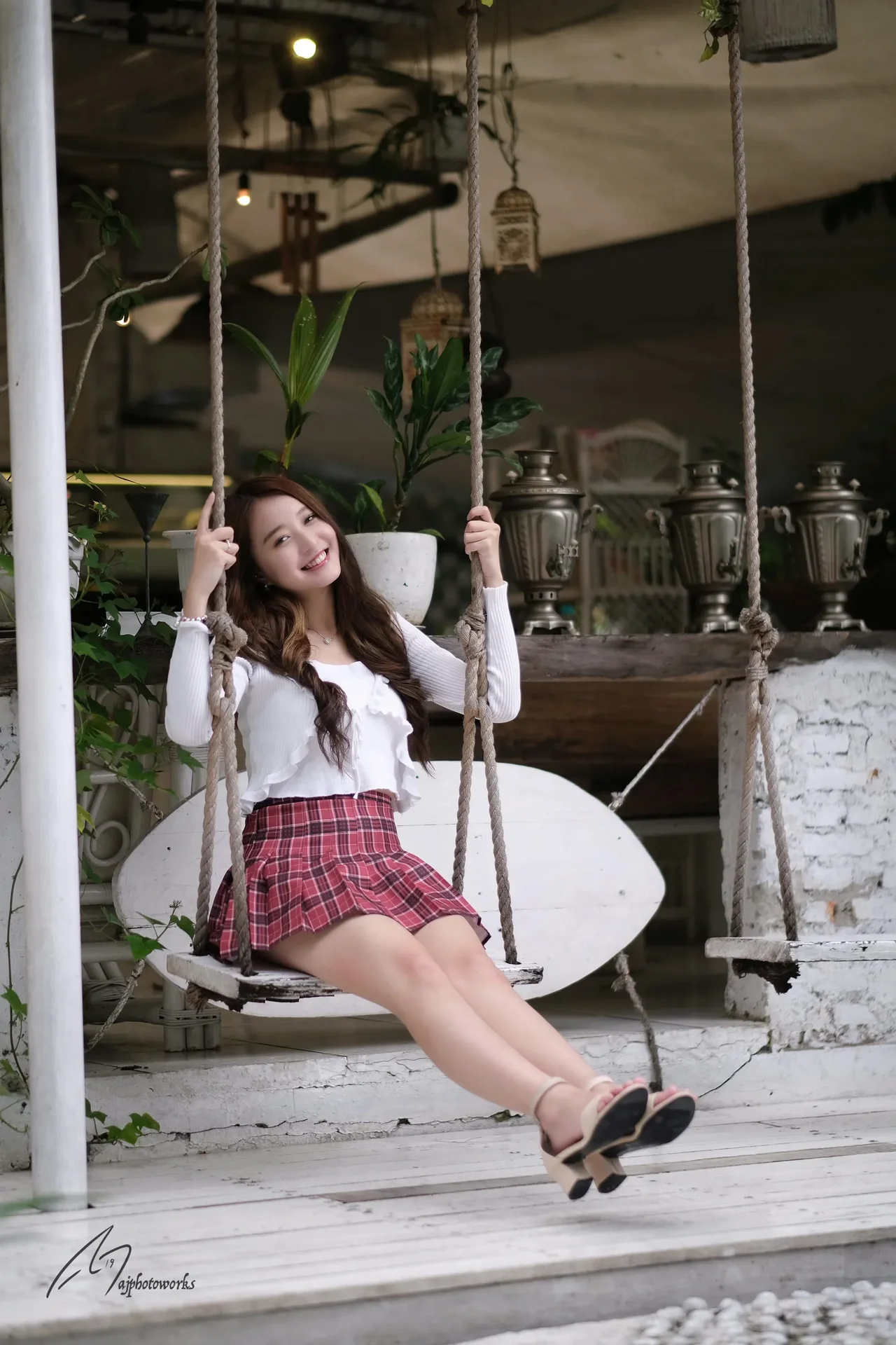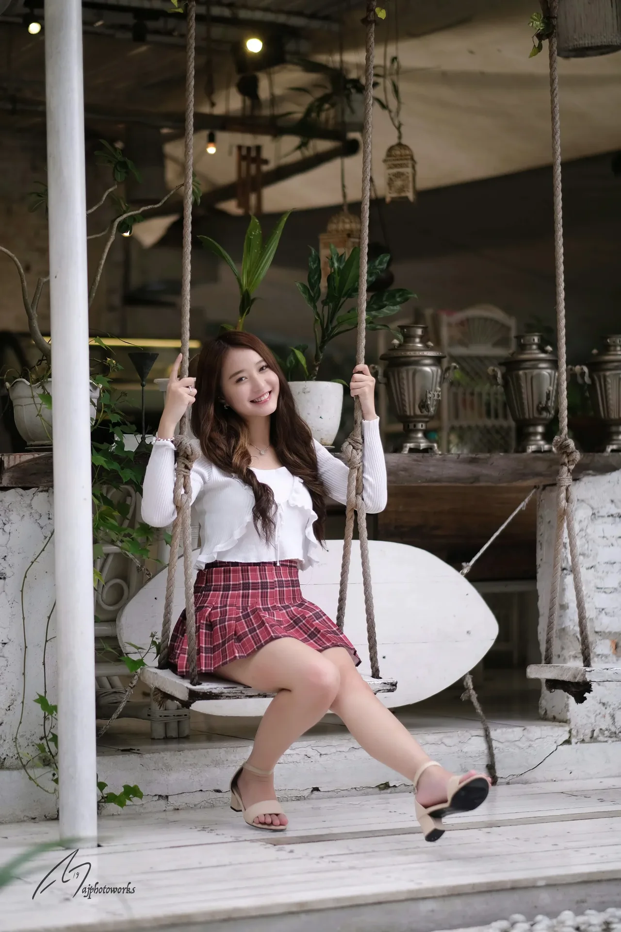 A woman in a white cropped top and red plaid skirt swings joyfully on a porch swing, surrounded by hanging plants and festive bistro decor under warm lights.
