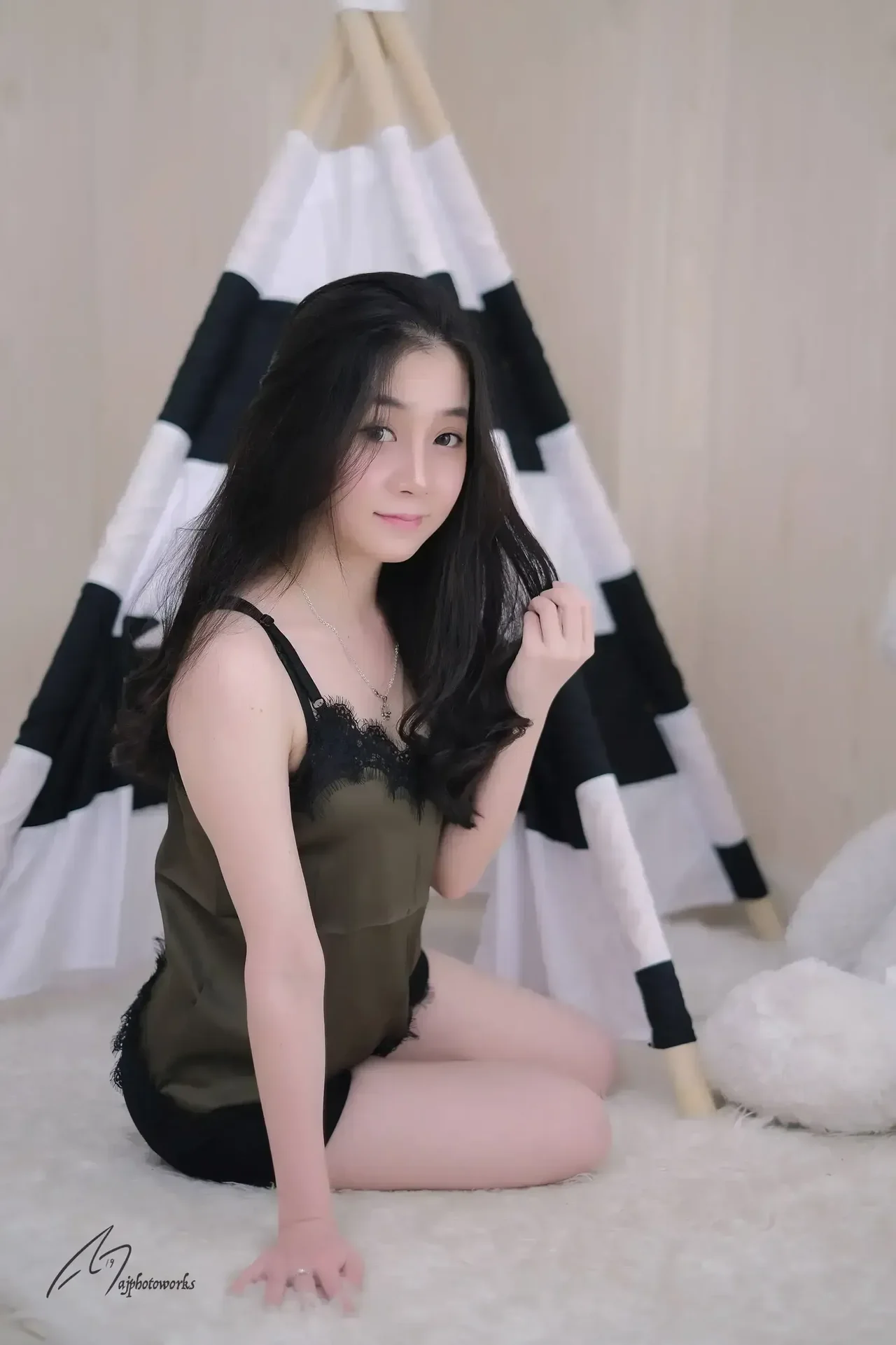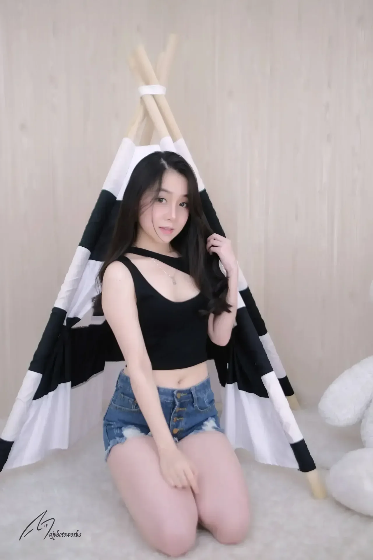Edgy black and white contrasts collide with playful denim and lace in a whimsical indoor fashion shoot.