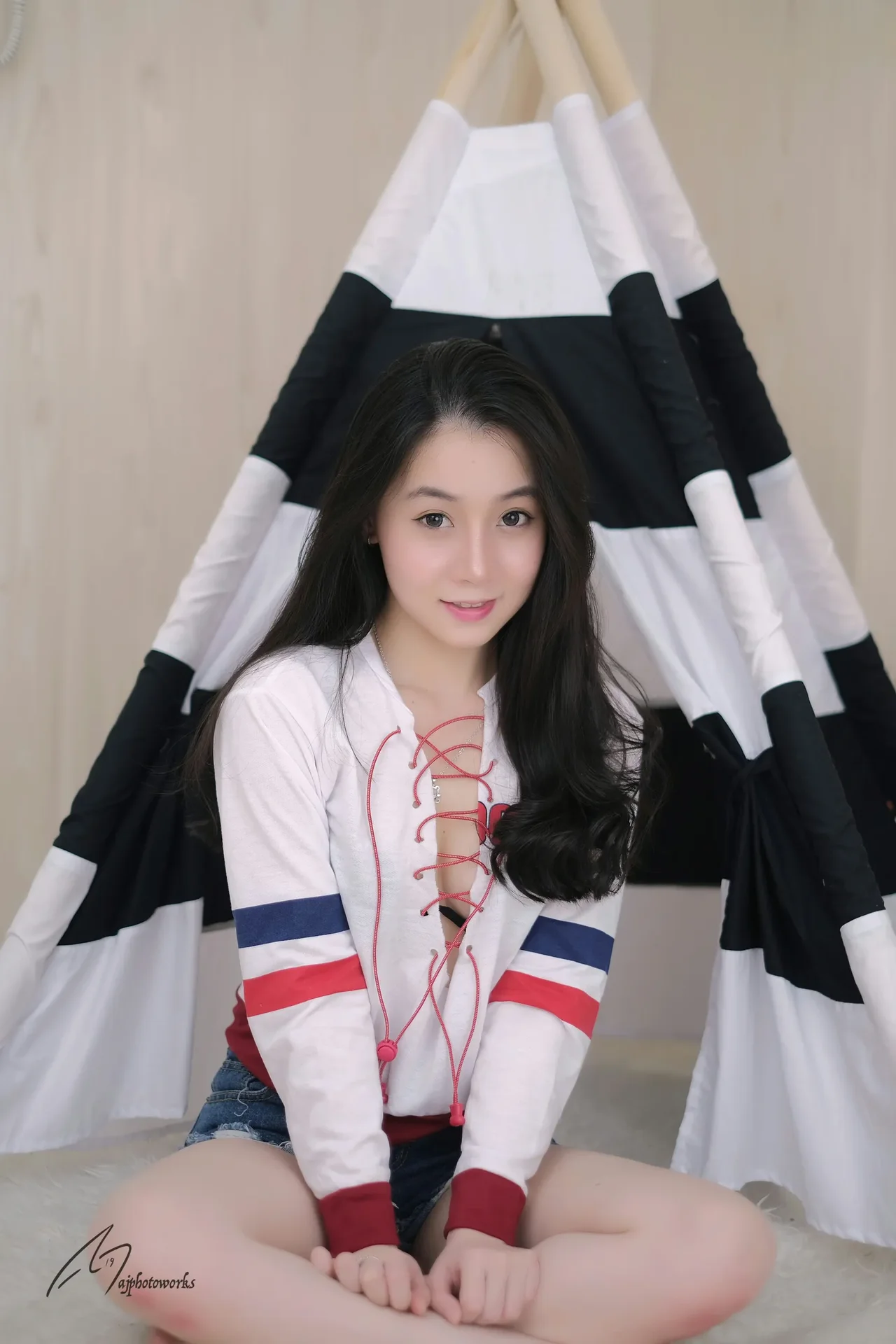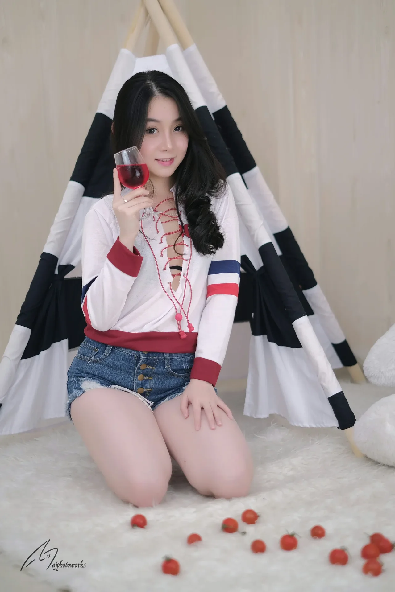 A playful, cozy scene featuring a stylish outfit with vibrant red accents against a contrasting black-and-white striped backdrop, enhanced by soft lighting and delicate cherry accents.