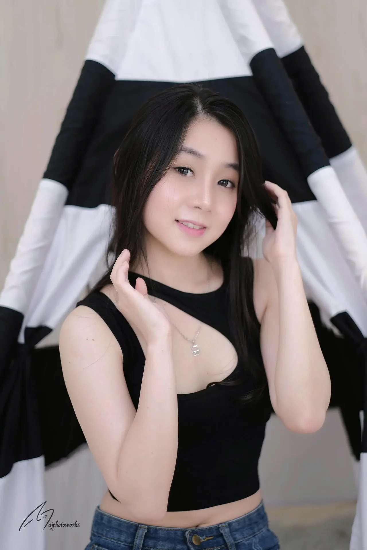 A playful and stylish fashion portrait featuring a model in a casual black top and denim shorts, set against a whimsical black and white polka dot tent and a soft white rug.