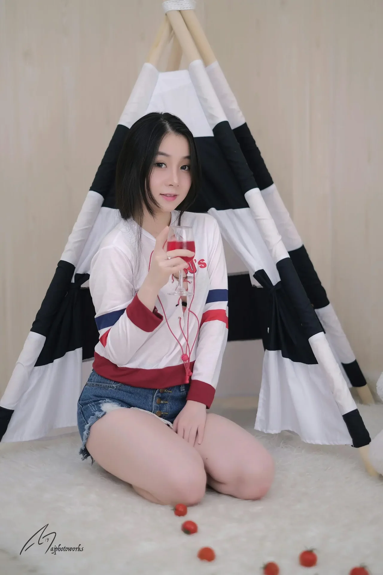 A vibrant and playful portrait featuring stylish attire, fresh cherry tomatoes, and a bold red beverage in a studio-set tent environment.