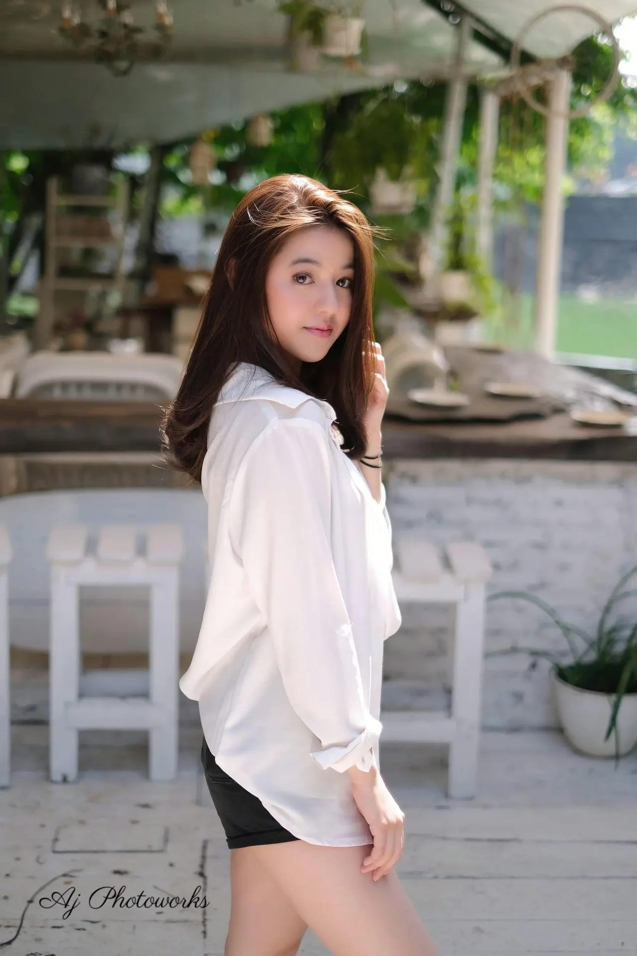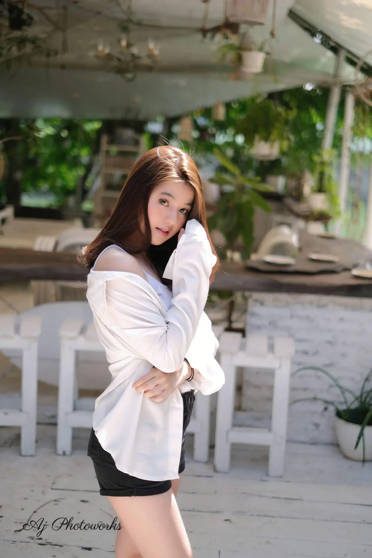 A woman in a casual white blouse and black shorts poses outdoors at a sunny café, smiling amidst potted plants and wooden furniture.