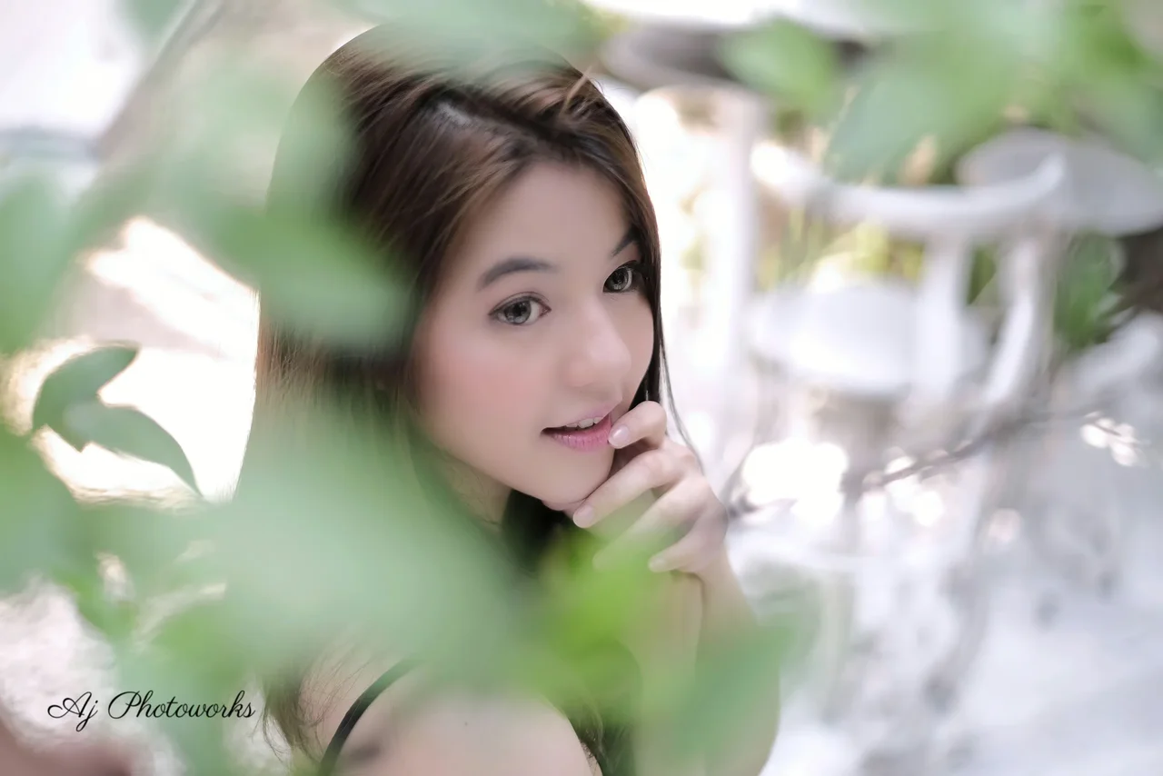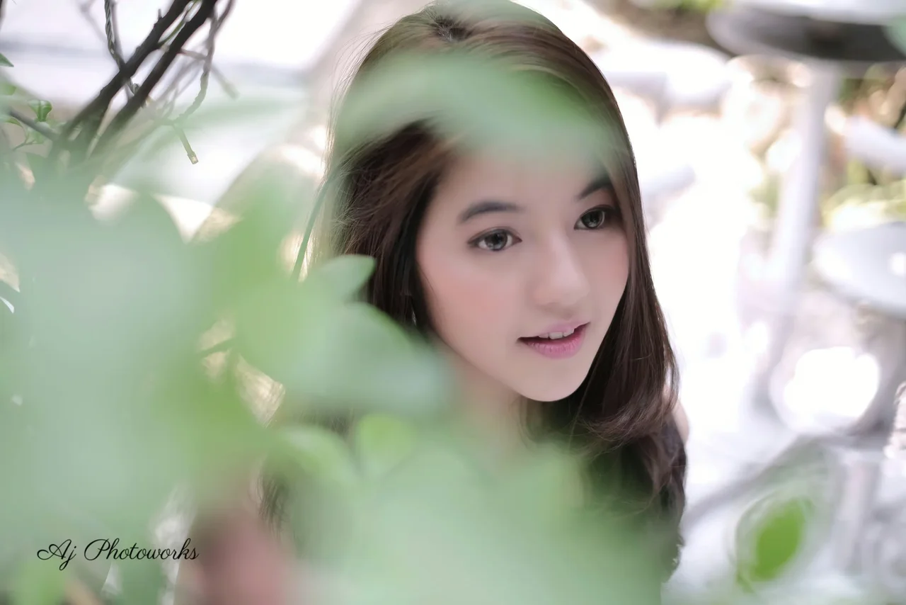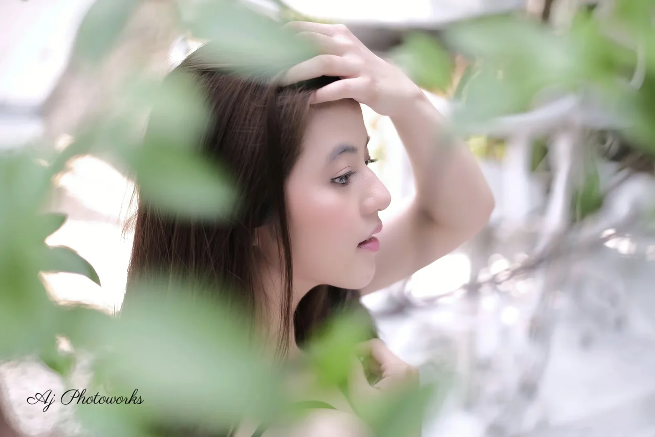 A serene natural portrait capturing soft light through foliage, highlighting natural beauty with subtle makeup and flowing hair.