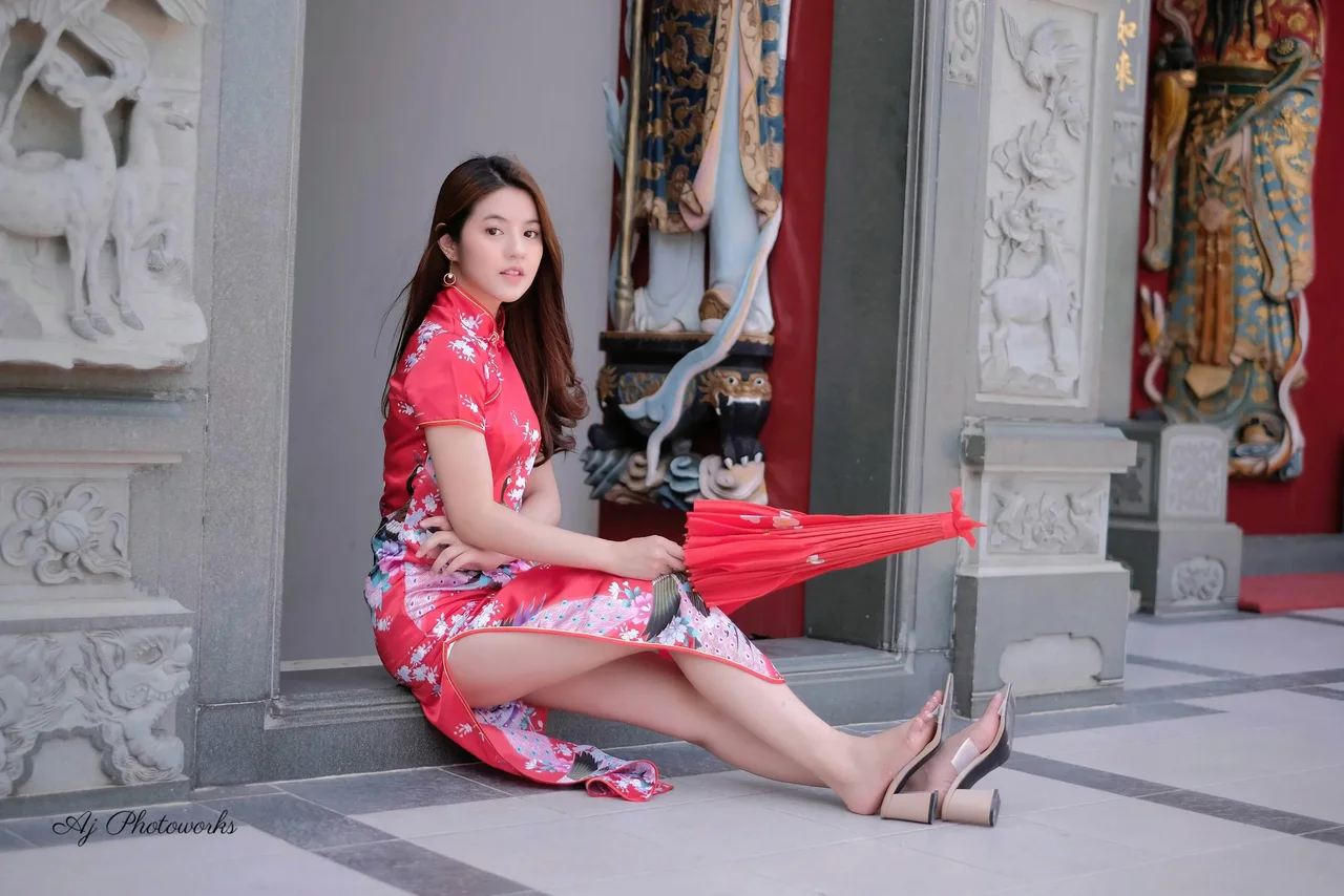 A traditional Chinese cheongsam blends with modern elegance, set against an ornate temple facade, capturing cultural heritage and timeless grace.