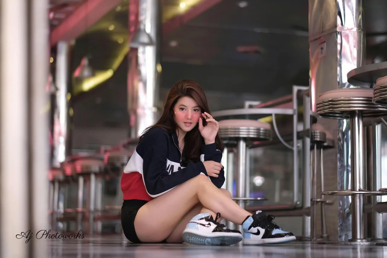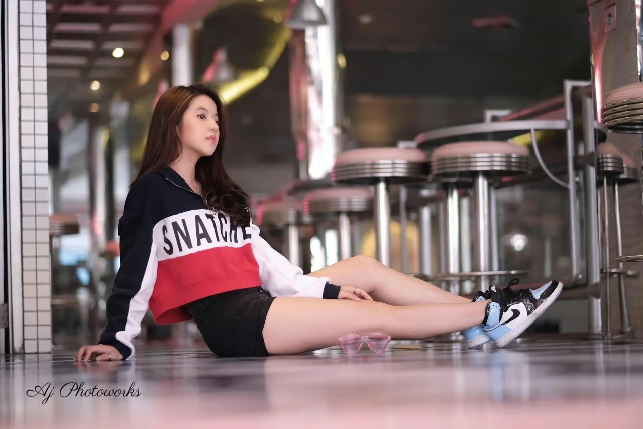 A dynamic editorial fashion portrait featuring vibrant retro diner aesthetics and striking wardrobe details.