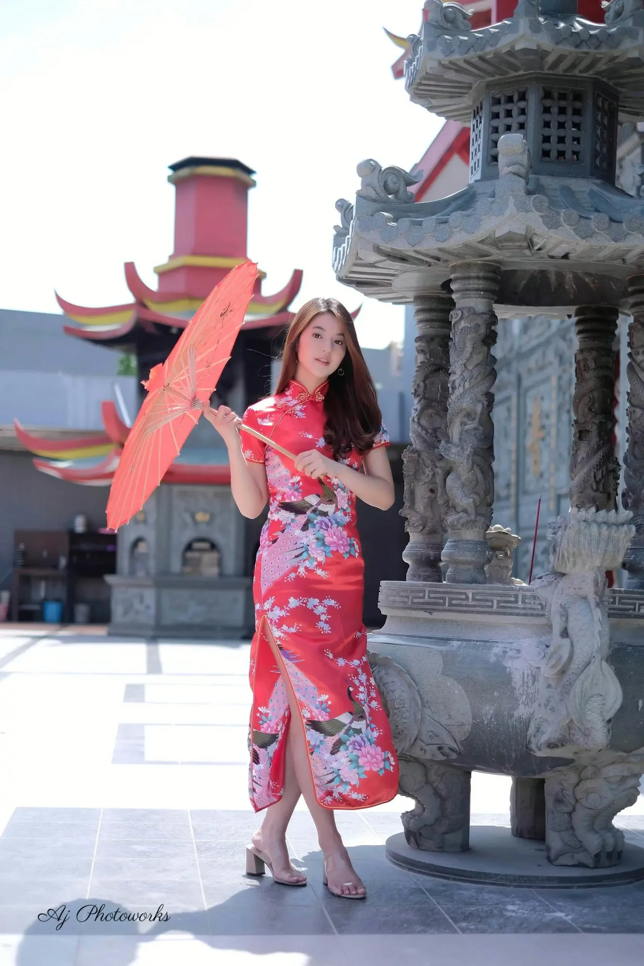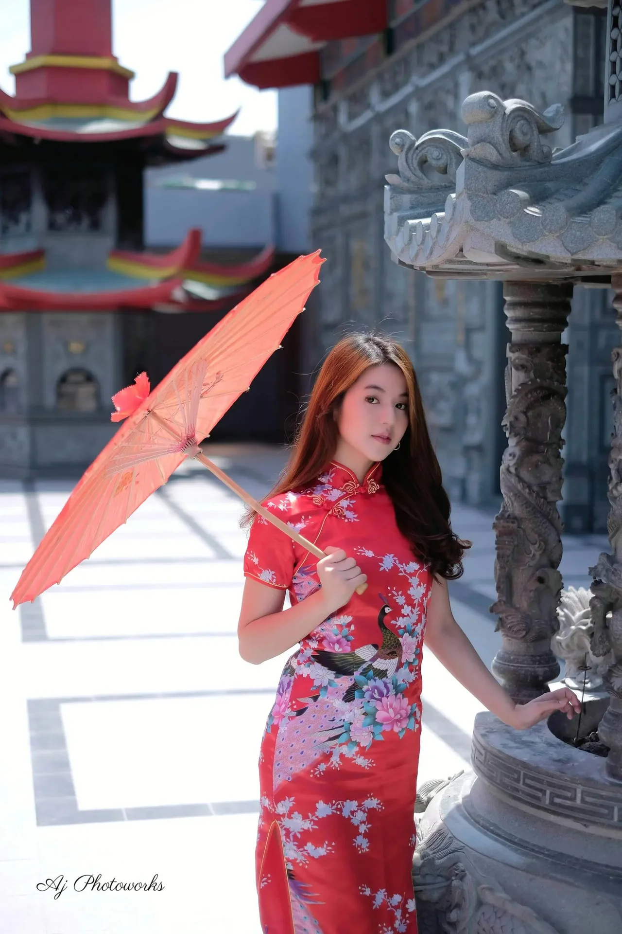 Vibrant red floral qipao with traditional motifs set against ornate Asian temple architecture, blending cultural heritage with modern portraiture.
