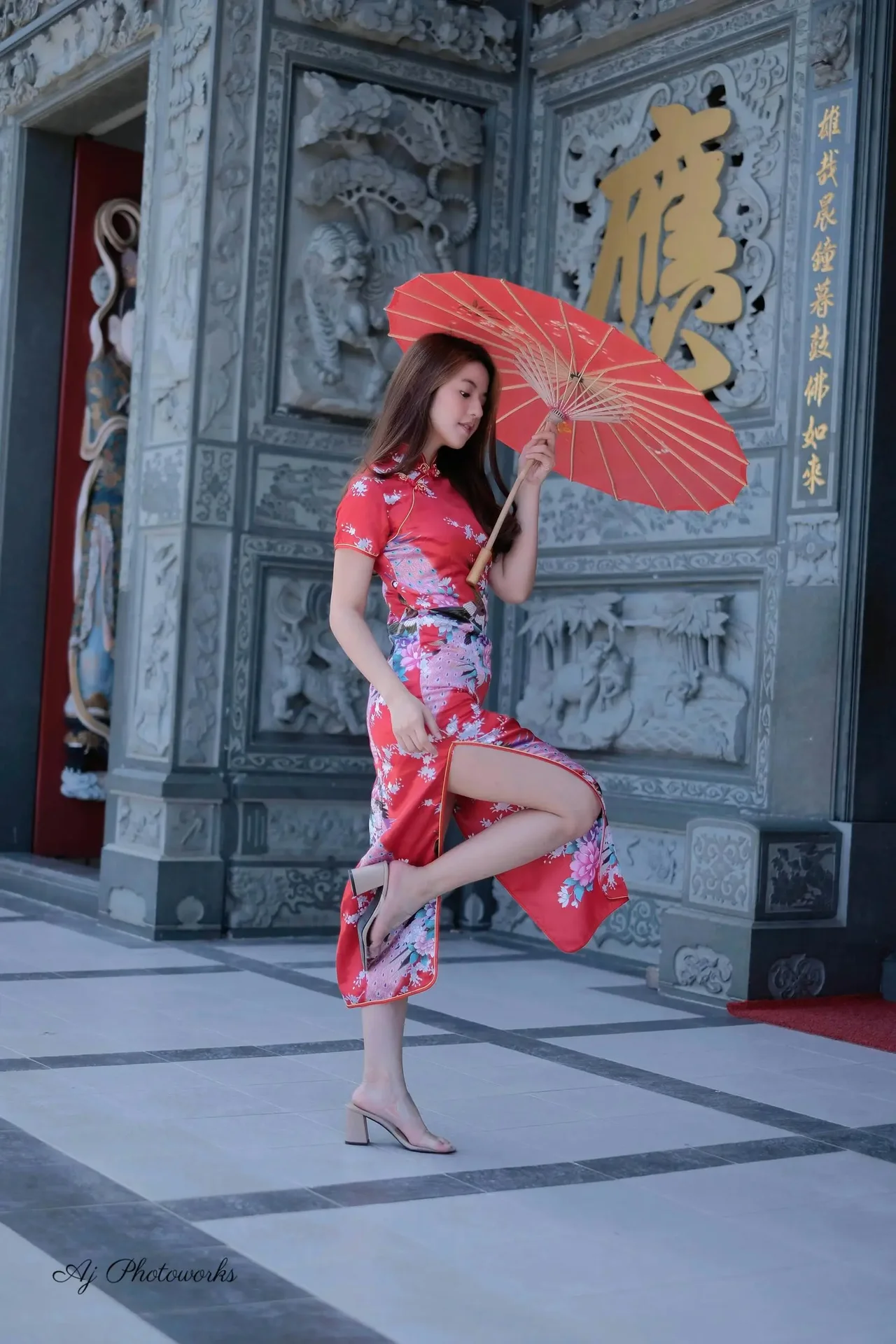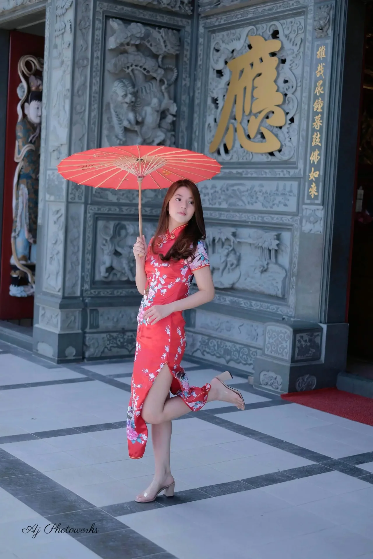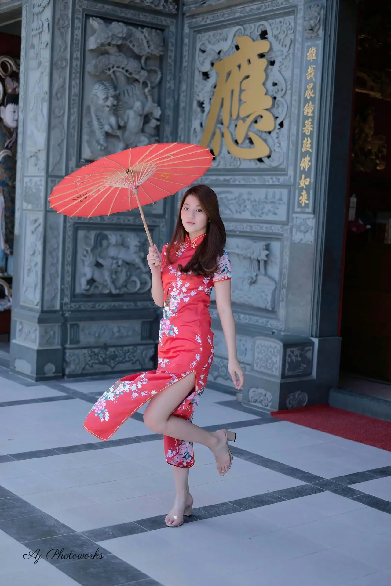 Elegance meets tradition in a vibrant red qipao adorned with floral patterns, framed by timeless architectural beauty.