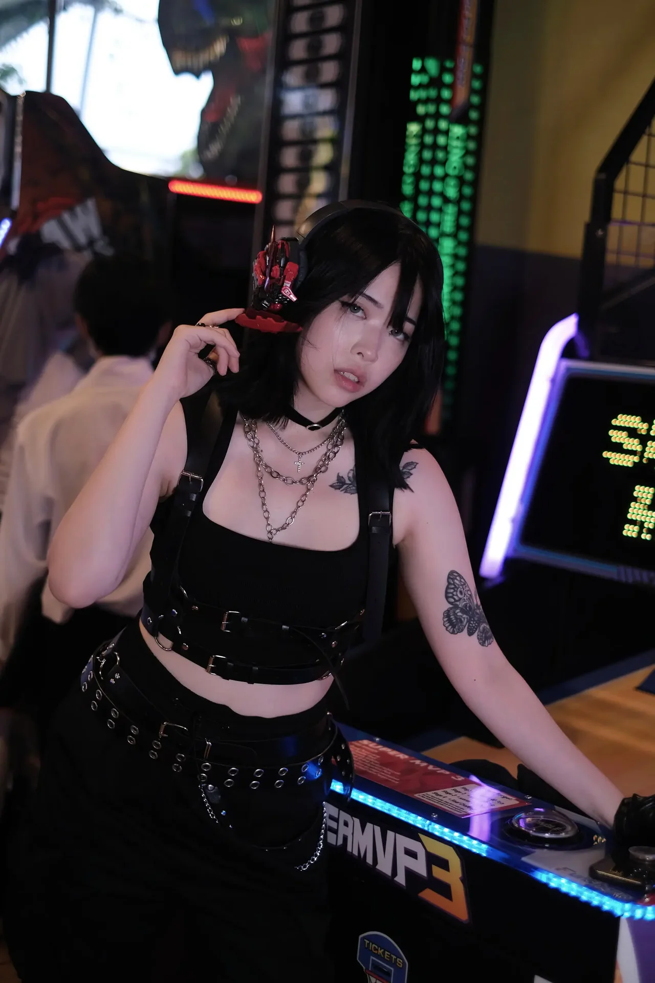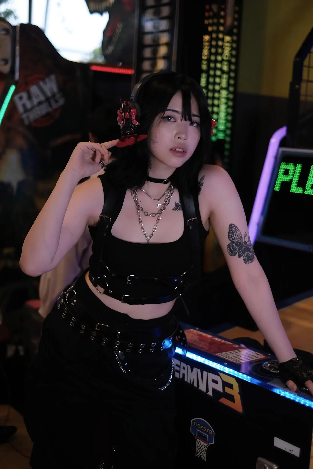 Gothic cosplay meets arcade energy in a vibrant blend of black, red, and neon lights.