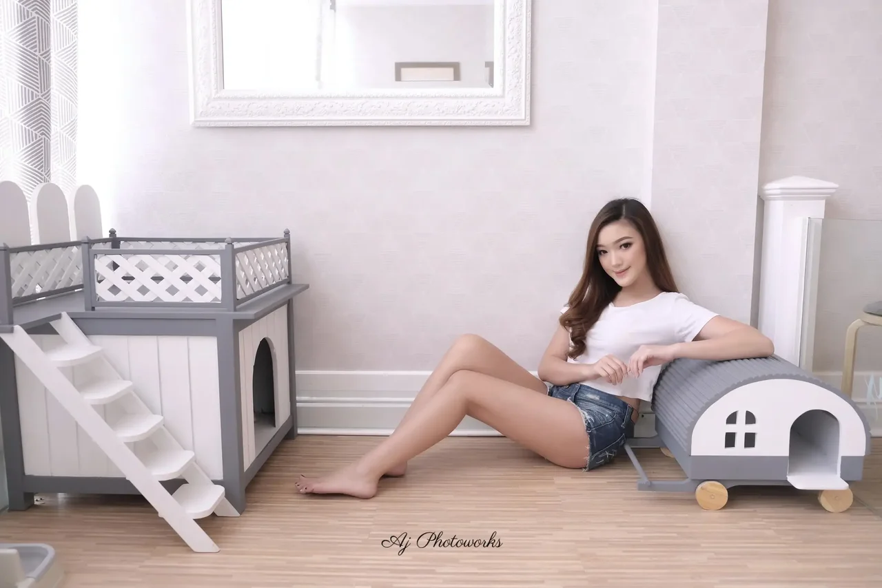 A playful and whimsical portrait of a woman in a bright interior, styled with bunny-themed accessories and cozy furnishings across various settings.