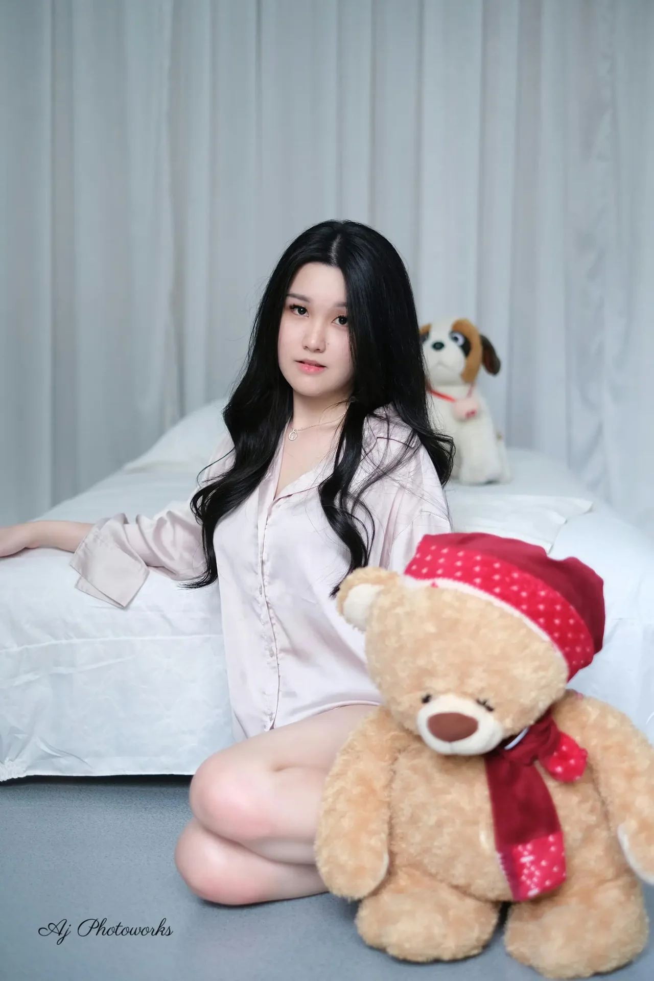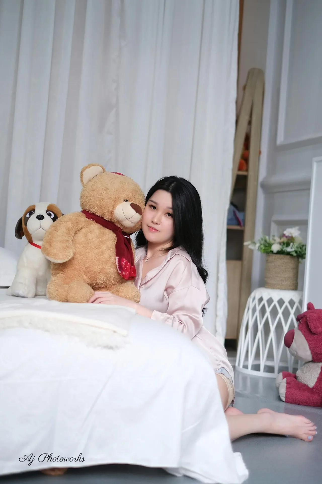 A serene moment in a cozy bedroom setting featuring soft lighting, pastel pink silk robe, and playful plush companions.